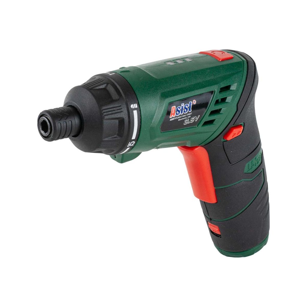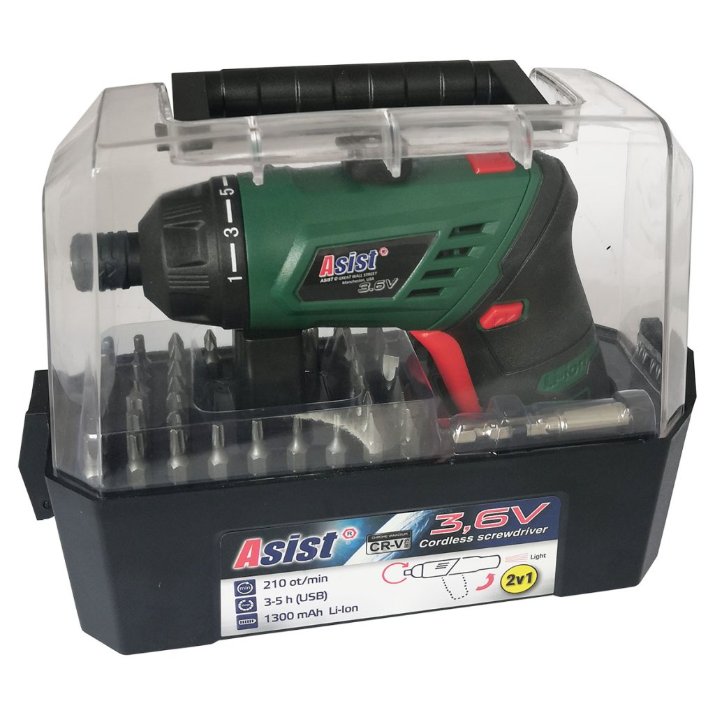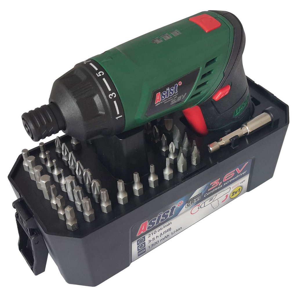 Aku šroubovák ASIST 3,6V 1300mAh baterie Li-on. Slouží k utažení a povolení šroubů a vrutů. Také možno vyvrtání potřebných malých otvorů do měkkých materiálů. Jednoduchá obsluha, rychlé nabíjení a dostatečná kapacita baterie. Dalšími výbornými doplňky jsou led kontrolka nabíjení, LED světlo a rukojeť soft grip. Lze také použít jako baterku.