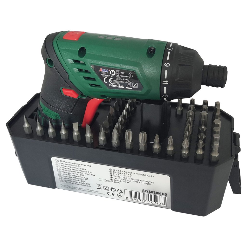 Aku šroubovák 3,6V Li-ion v boxu 50dílů ASIST AE2S03DN-50 ASIST