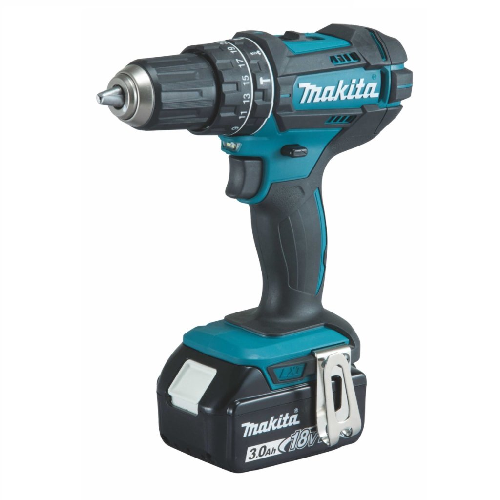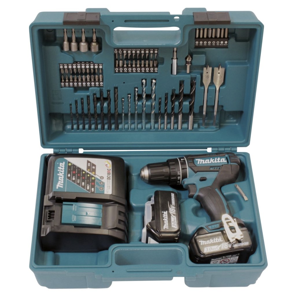 Max. točivý moment 62 N.m, sklíčidlo 13mm, ochrana proti hlubokému vybití baterie, dvojité LED světlo, 2stupňová celokovová převodovka, XPT - pro práci v náročných podmínkách, 2x baterie 3Ah 18V, 74ks příslušenství, v kufru