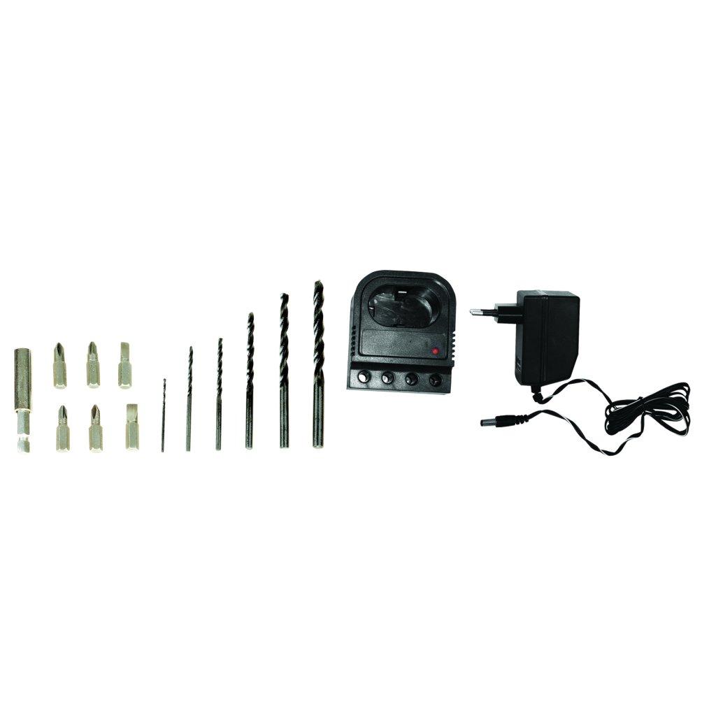1x nabíječka6x HSS vrták do kovu (1.5, 2.5, 3, 4, 5, 6mm ) 2x plochý bit4x křížový bit1x prodlužovací bit 1x náhradní akumulátorDoplňkové parametry