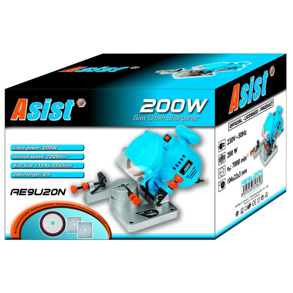 Elektrická bruska na pilové řetězy značky ASIST vám pomůže nabrousit řetěz na vaši motorovou pilu. Má výkon 200 Wattů s otáčkami až 7000 otáček za minutu. Je vybavena brusným kotoučem průměru 104 milimetrů, otočným stolem, úhloměrem a ochranným krytem