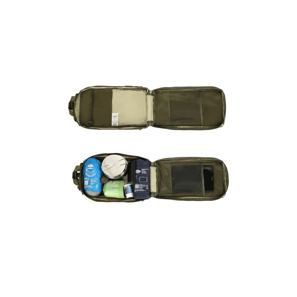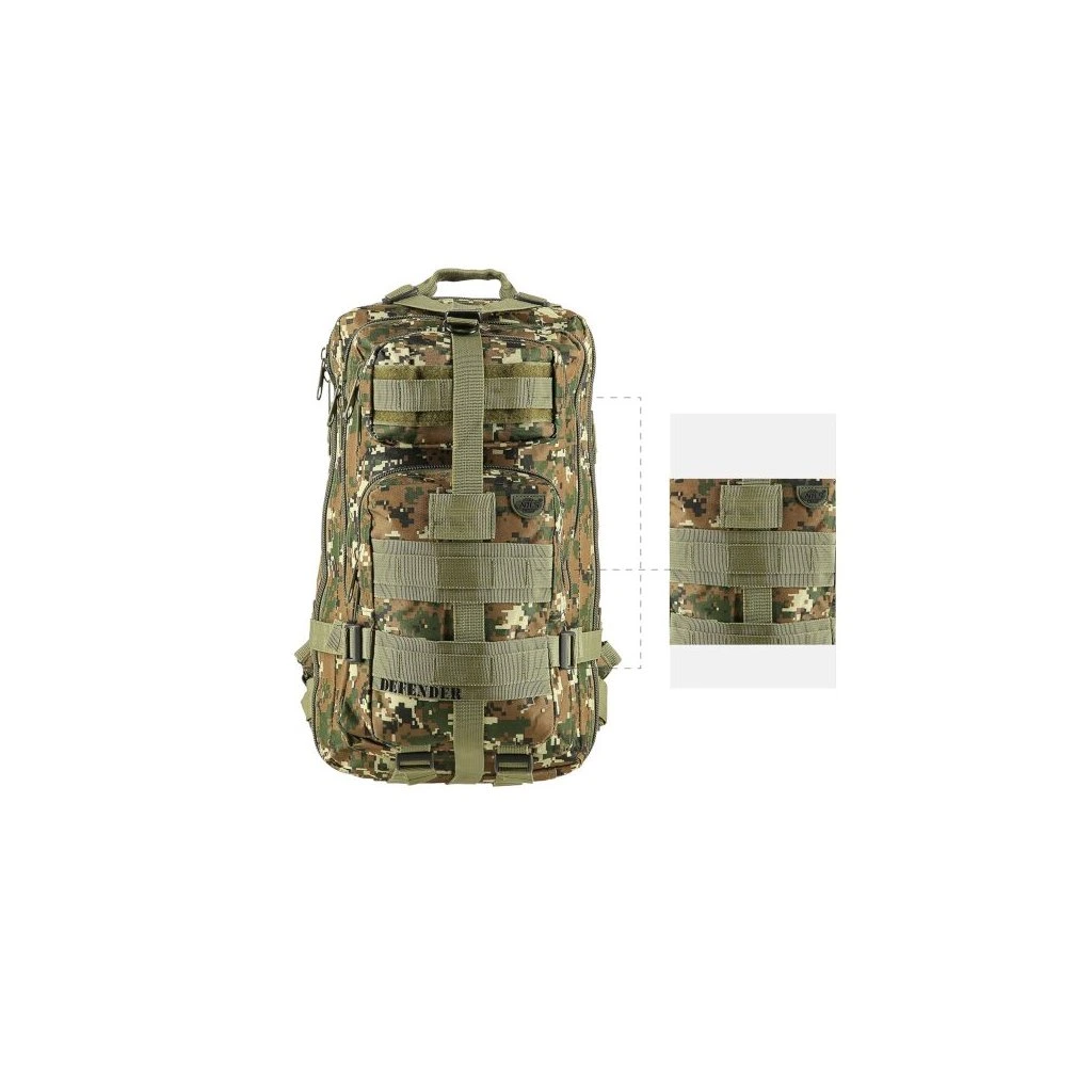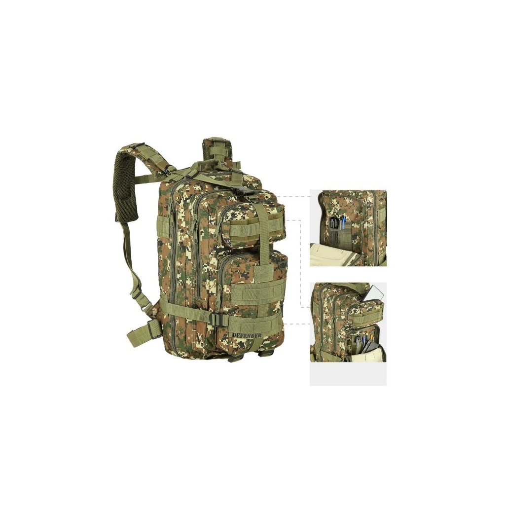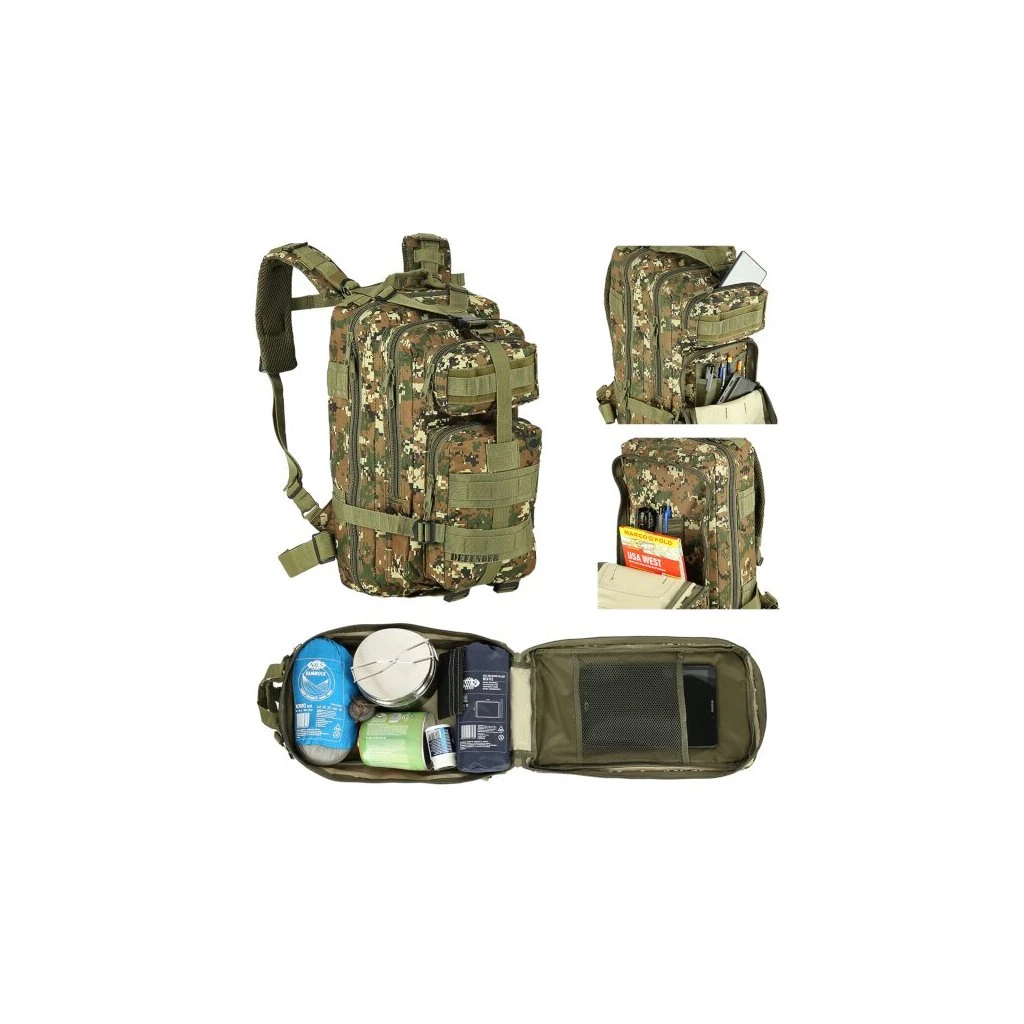 Model Defender má celkem 4 komory o celkovém objemu 30 litrů. Všechny komory jsou opatřeny dvoucestným zipem. Hlavní komora má zip po téměř celém obvodu a je možné ji zcela otevřít pro pohodlný přístup, víko komory je opatřeno síťovinovou kapsou, do které se vejde například tablet. Prostřední komora obsahuje hlavní prostor například pro dokumenty a mapu, na stěně komory jsou dále 2 kapsy například pro tužky, propisky, buzolu nebo svítilnu. Přední, horní komora je určena na menší předměty jako je například powerbanka, nebo mobilní telefon. Přední dolní komora nabízí krom hlavního prostoru také další řadu kapsiček na drobnosti. Na zadní straně se nachází ještě jedna plochá kapsa na suchý zip.