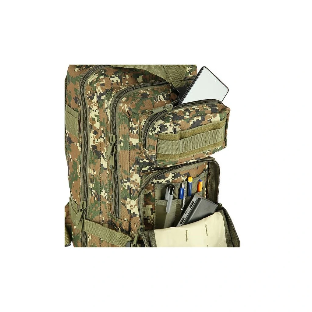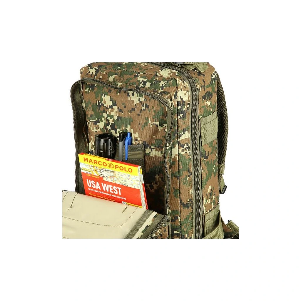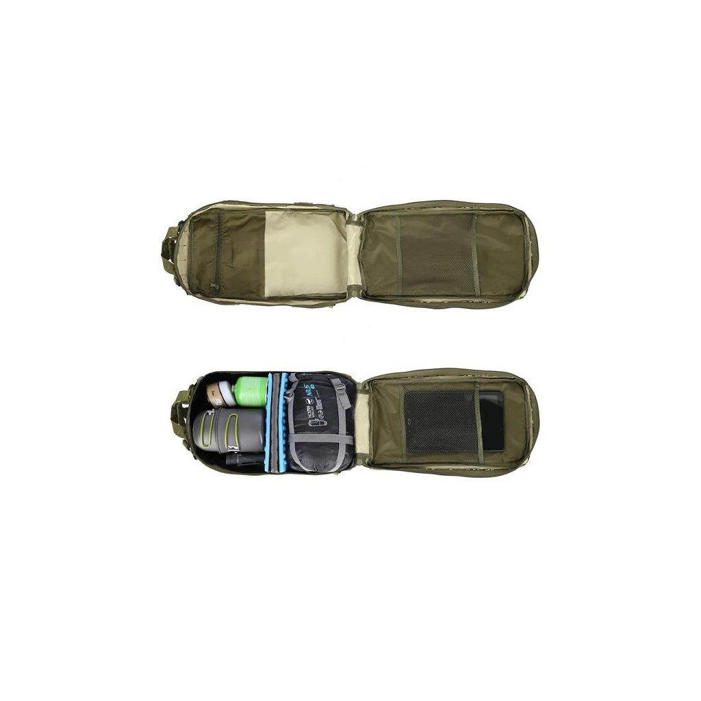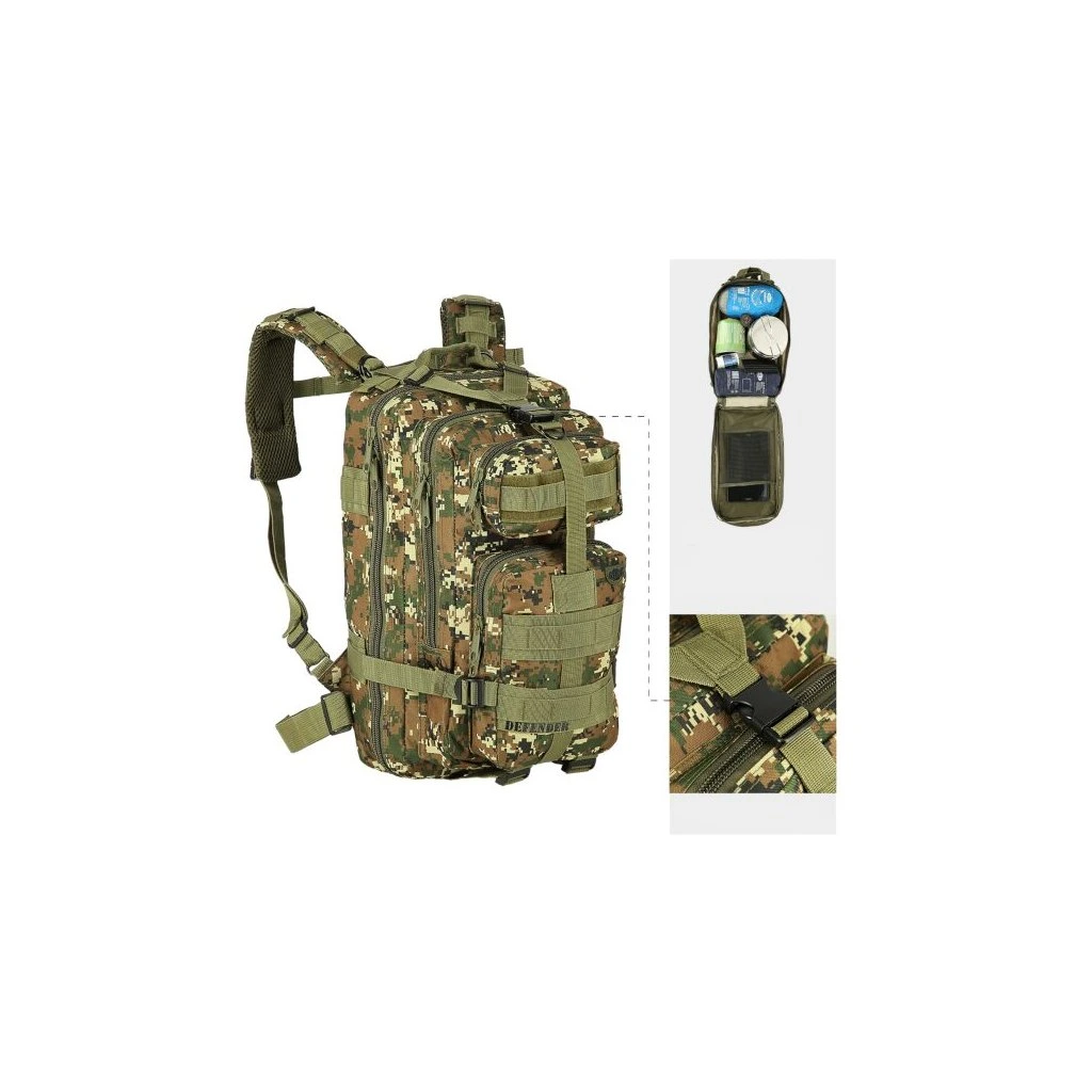 Model Defender má celkem 4 komory o celkovém objemu 30 litrů. Všechny komory jsou opatřeny dvoucestným zipem. Hlavní komora má zip po téměř celém obvodu a je možné ji zcela otevřít pro pohodlný přístup, víko komory je opatřeno síťovinovou kapsou, do které se vejde například tablet. Prostřední komora obsahuje hlavní prostor například pro dokumenty a mapu, na stěně komory jsou dále 2 kapsy například pro tužky, propisky, buzolu nebo svítilnu. Přední, horní komora je určena na menší předměty jako je například powerbanka, nebo mobilní telefon. Přední dolní komora nabízí krom hlavního prostoru také další řadu kapsiček na drobnosti. Na zadní straně se nachází ještě jedna plochá kapsa na suchý zip.