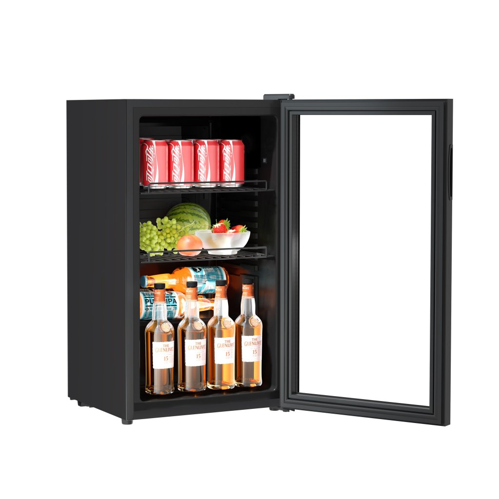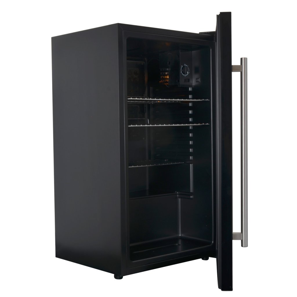 Vitrína nabízí celkový objem 80 l s temperovaným sklem. Směr otevírání dveří vitríny lze snadno měnit a police jsou nastavitelné. Nastavitelná teplota chlazení už od 3°CČistý objem 80 l
