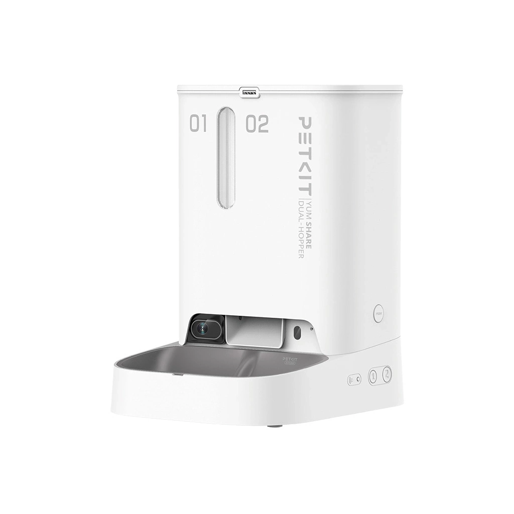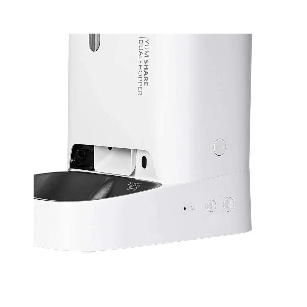 The PetKit Yumshare Dual Hopper is an intelligent pet feeder equipped with a wide-angle camera and a two-way microphone, allowing you not only to observe your pet but also to interact with them and record video. Additionally, the camera can automatically detect and analyze the amount of food remaining in the bowl, and based on the analysis results, it can withhold the next meal to prevent overfeeding and food wastage. With the PETKIT app, users can schedule meals based on the day of the week, the quantity, and size of the meals. Food can also be dispensed manually by pressing and holding the button located at the base of the device – your pet won't be able to press it like the button that opens the food container lid. PetKit Yumshare Dual Hopper can be powered by two sources - electrical outlet power, which is the main power source, or 5 AAA batteries, which are used in case of a power outage.