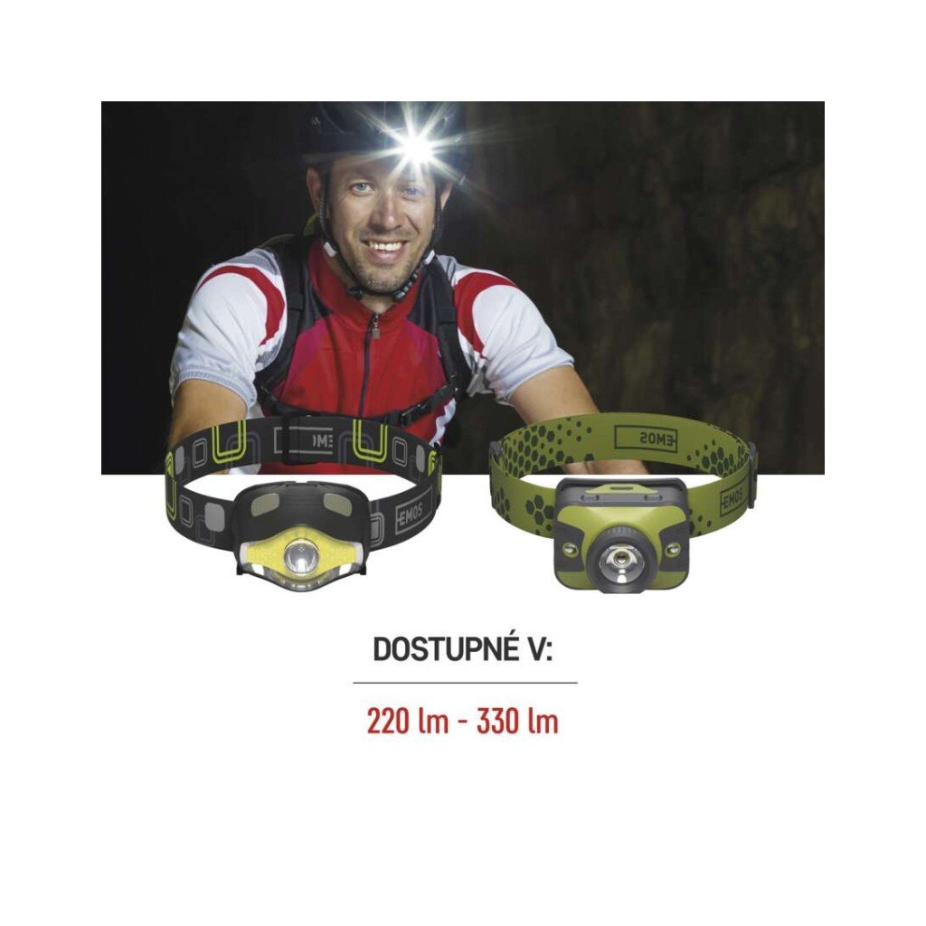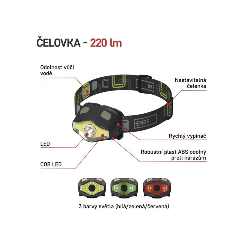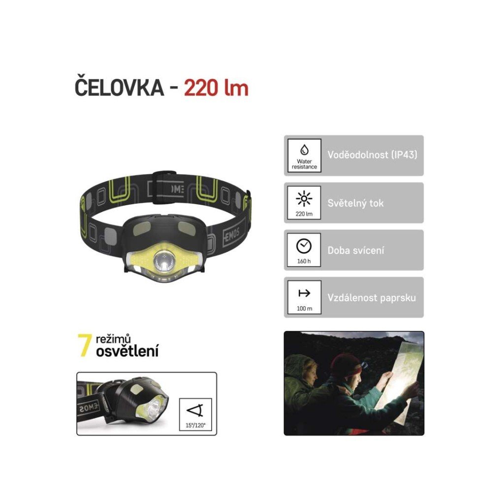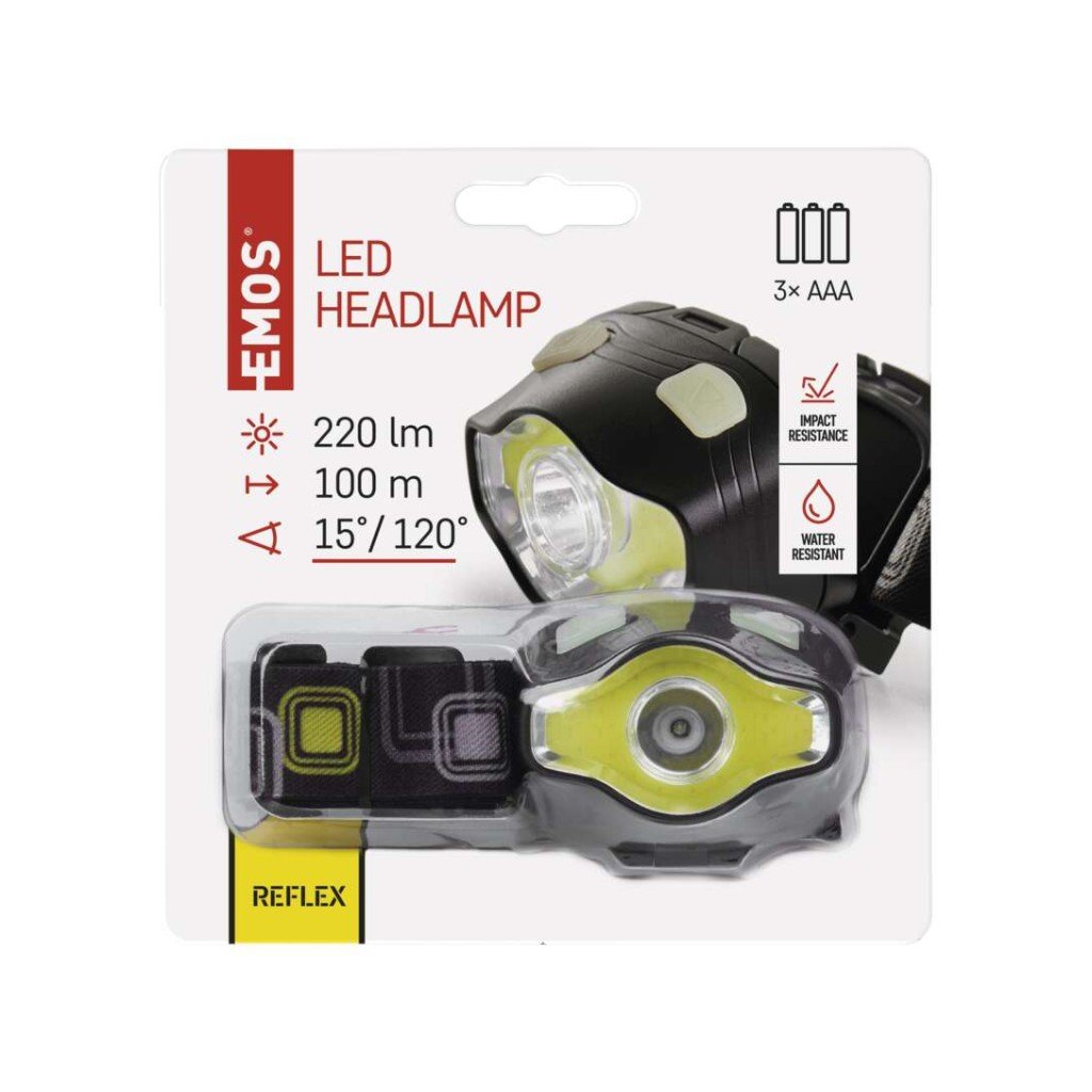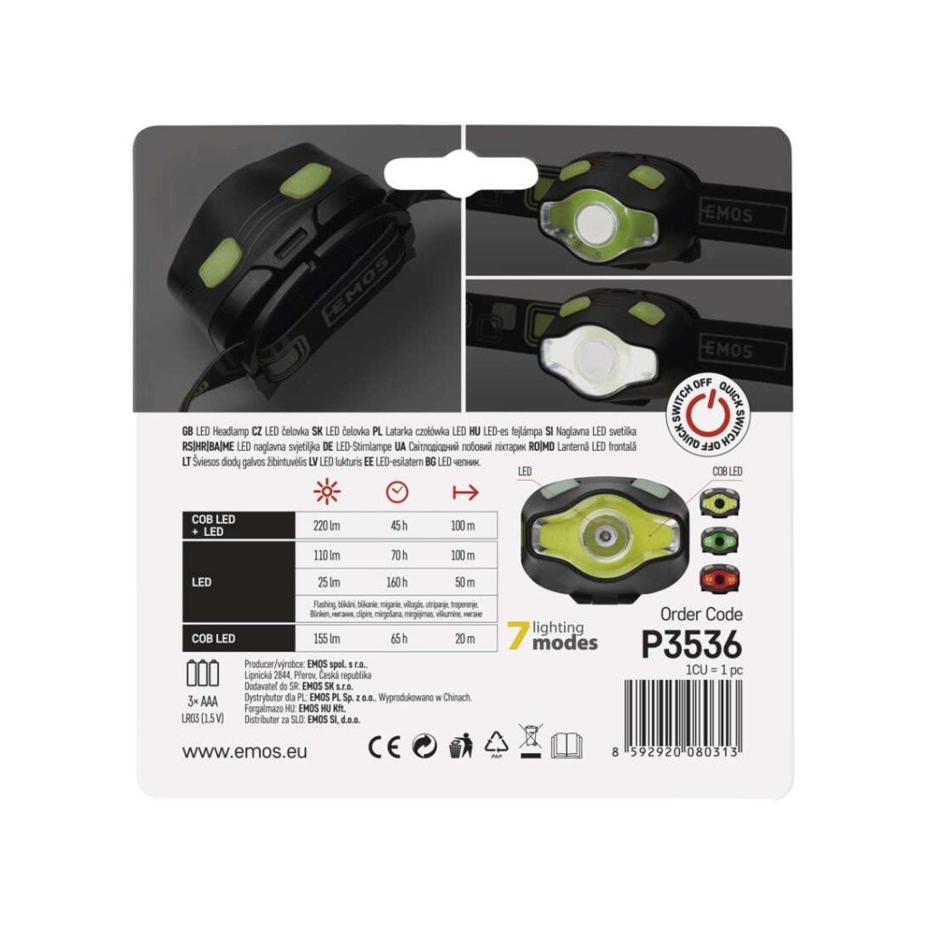 COB LED + LED čelovka P3536, 220 lm, 100 m, 3× AAA EMOS