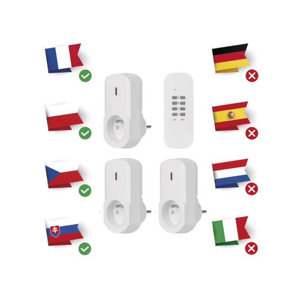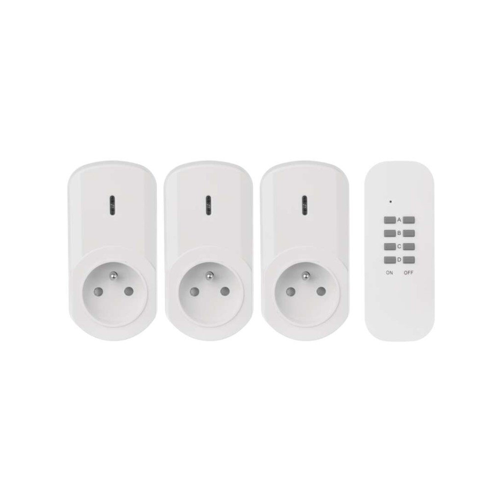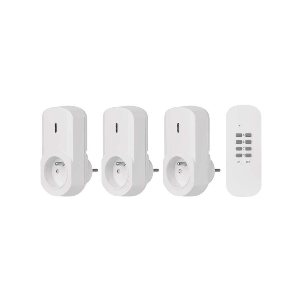 produkt: dálkově ovládané zásuvky, 3 zásuvky + 1× dálkový ovladač, typ: FRENCH, napětí/proud: 230 V~/4,35 A max., max. zátěž: 1 000 W, barva: bílá, dětské clonky, krytí: IP20, materiál: plast, počet zásuvek: 1× 2P + PE, počet pólů: 2P + PE, dálkový ovladač: napájení 1× CR2032 3 V (součástí balení), dosah signálu: až 25 m ve volném prostoru, easy learning: manuální přiřazení zásuvek k ovladači, možnost ovládání: až 4 zásuvky, přenosoná frekvence: 433,92 MHz, prodejní obal: 1 ks, krabička, záruční doba: 2 roky