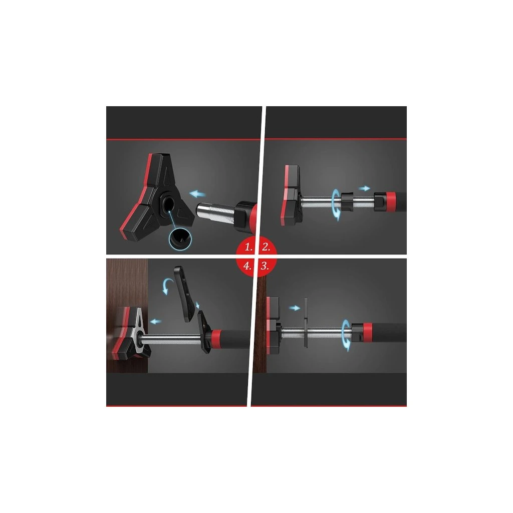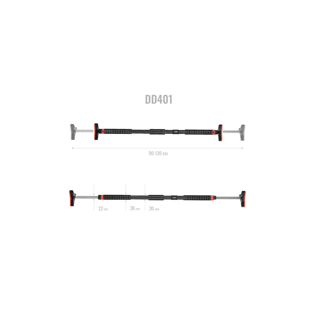 Po vytažení hrazdy z balení se na její konce nasadí koncovky. Hrazdu si na zemi roztáhneme tak, aby byla o několik centimetrů kratší, než je šířka zárubní a dotažením černých matic zajistíme délku hrazdy. DD401 vložíme do zárubní, pomocí dodávané vodováhy ji vyrovnáme a dotáhneme černé matice. Jakmile hrazda drží, tak si z koncovek vytáhneme klíč, který si prodloužíme pomocí nástavce a následně dotáhneme černé matice tak, aby hrazda pevně držela. Nástavec a vodováhu si uschováme pro další použití, klíče nacvakneme zpět do koncovek a můžeme začít s tréninkem.