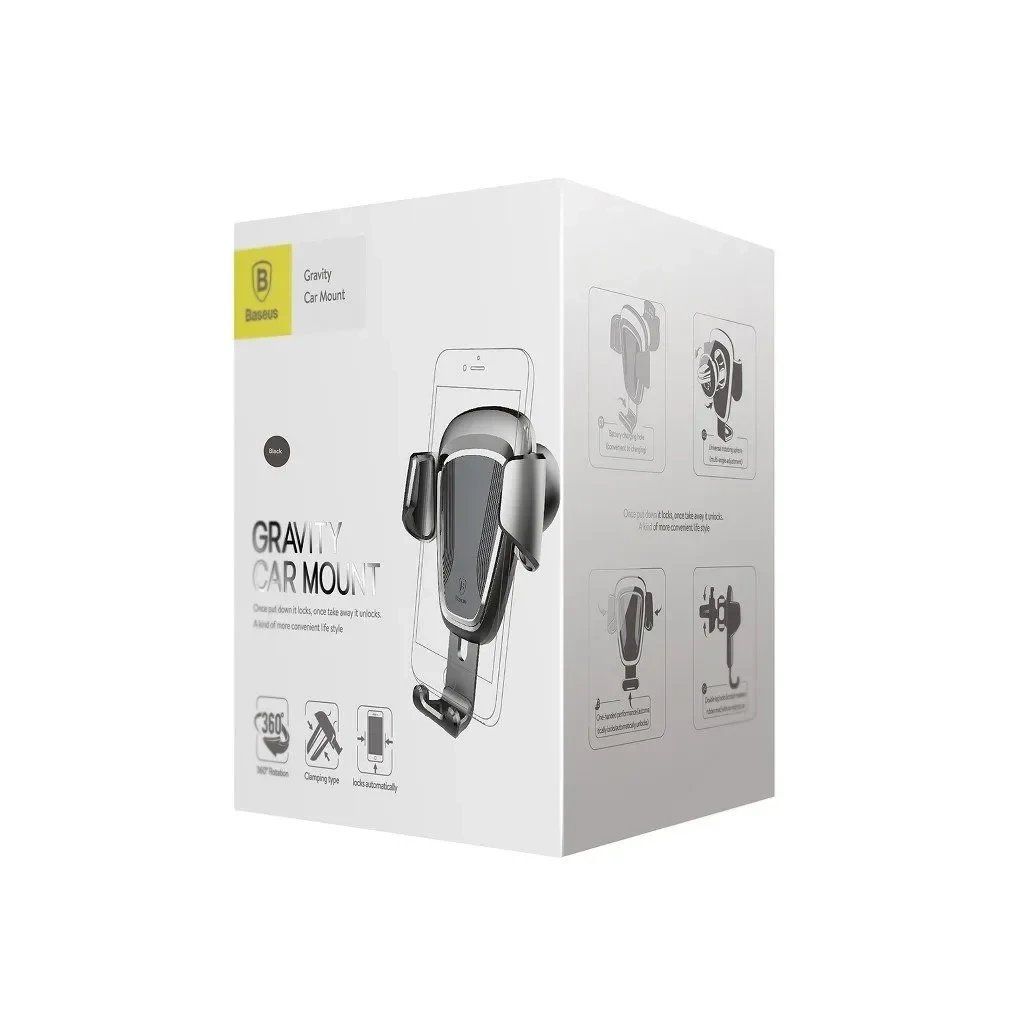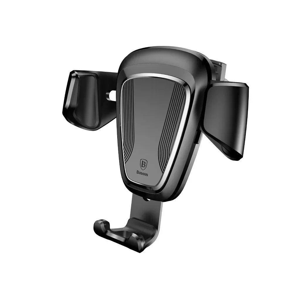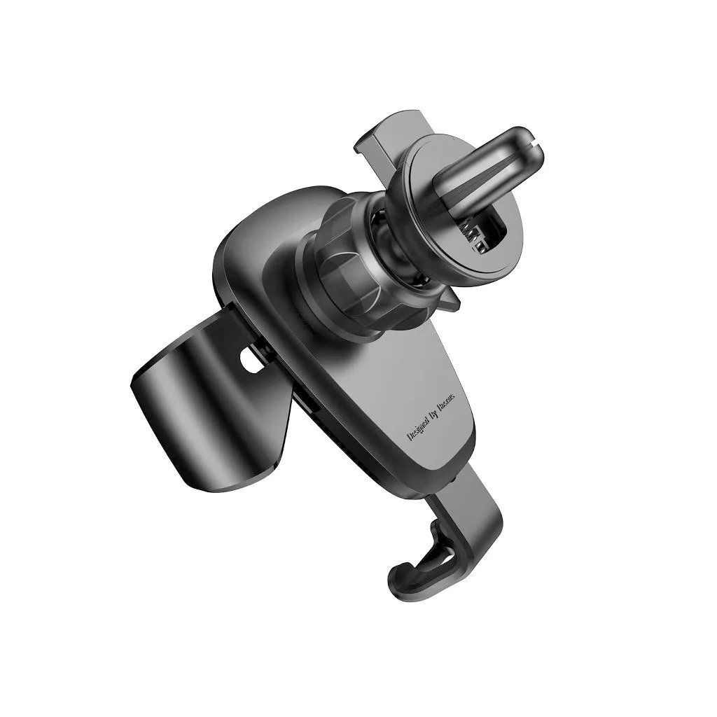 Gravitační držák telefonu Baseus se upevněje na větrací mřížce automobilu. Rozsah nastavení držáku je 360 stupňů. Určeno pro telefony o šířce 63 až 88 cm. Boční svorky držáku se automaticky přizpůsobí šířce telefonu. Umožňuje připojení nabíječky.