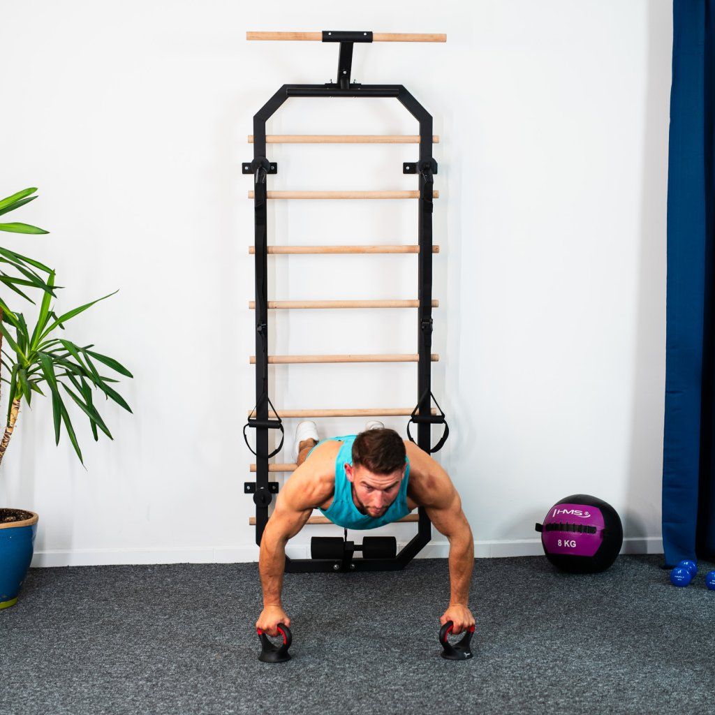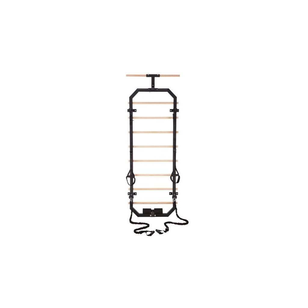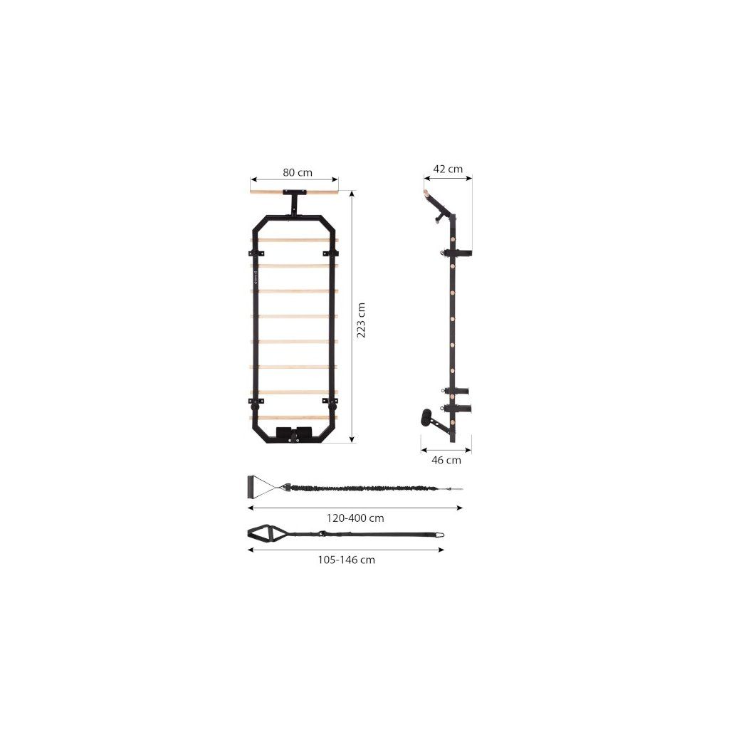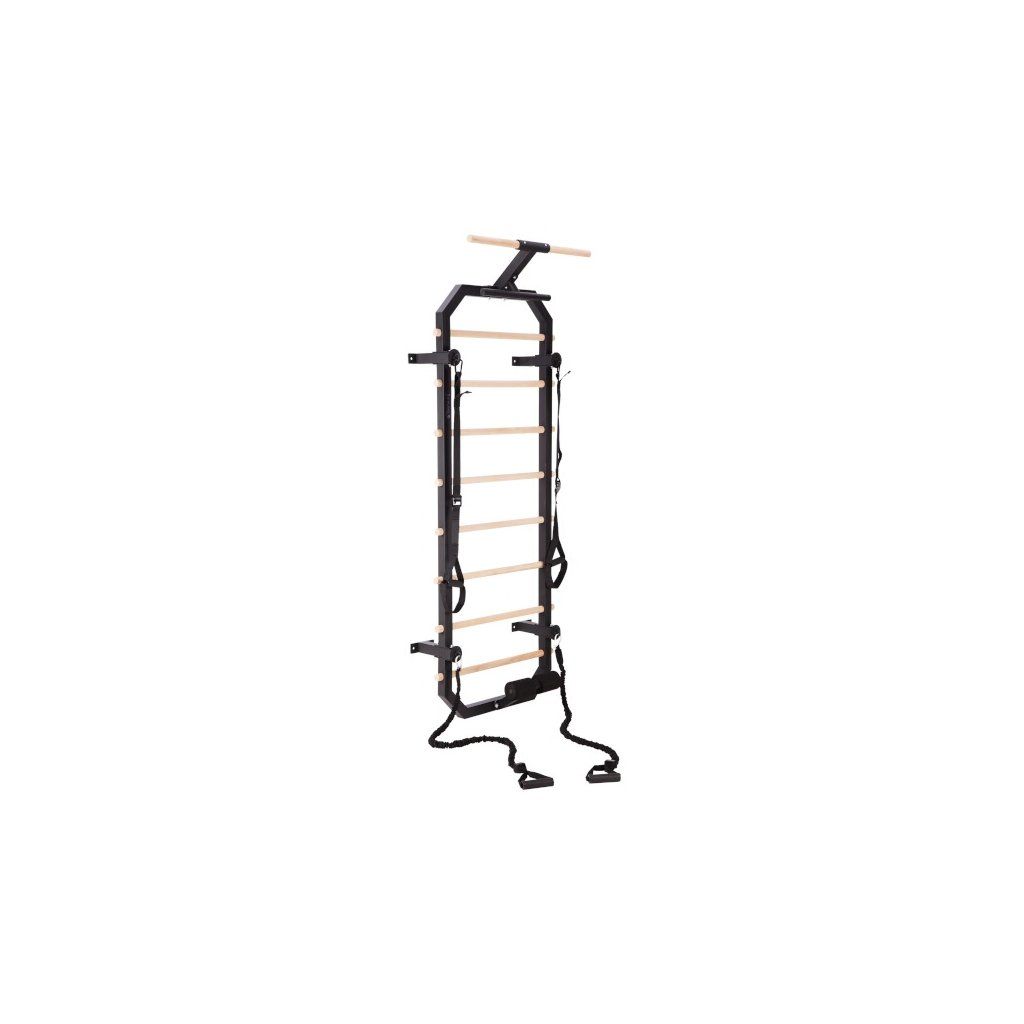 Příčky z bukového dřeva se po instalaci do žebřiny zajišťují šroubem ze zadní strany konstrukce, takže pevně drží na svém místě a neprotáčí se. V horní části žebřin se nachází 80 cm široká hrazda a kovová "polo hrazda" která slouží například k instalaci popruhů, nebo expandérů, ty lze také připevnit k ocelovým okům na 4 vzpěrách. Ve spodní části se nachází zarážka nohou pro trénink sed-lehů. Pro maximální pohodlí jsou zarážky opatřeny pěnovými válci.