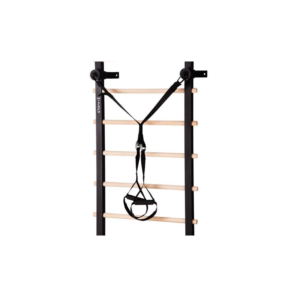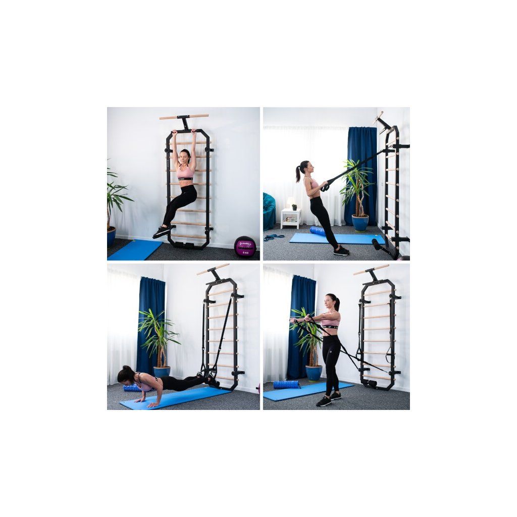 Multifunkční žebřiny HMS DW2708 jsou ideální náčiní pro domácí trénink. Sada se skládá z gymnastických žebřin, které se připevňují ke zdi, 2 expandérů zakončených úchopem a 2 tréninkových popruhů s nastavitelnou délkou. Produkt je vyroben z kvalitní oceli a má 8 příček z bukového dřeva. Žebřiny jsou 223 cm vysoké a 80 cm široké.