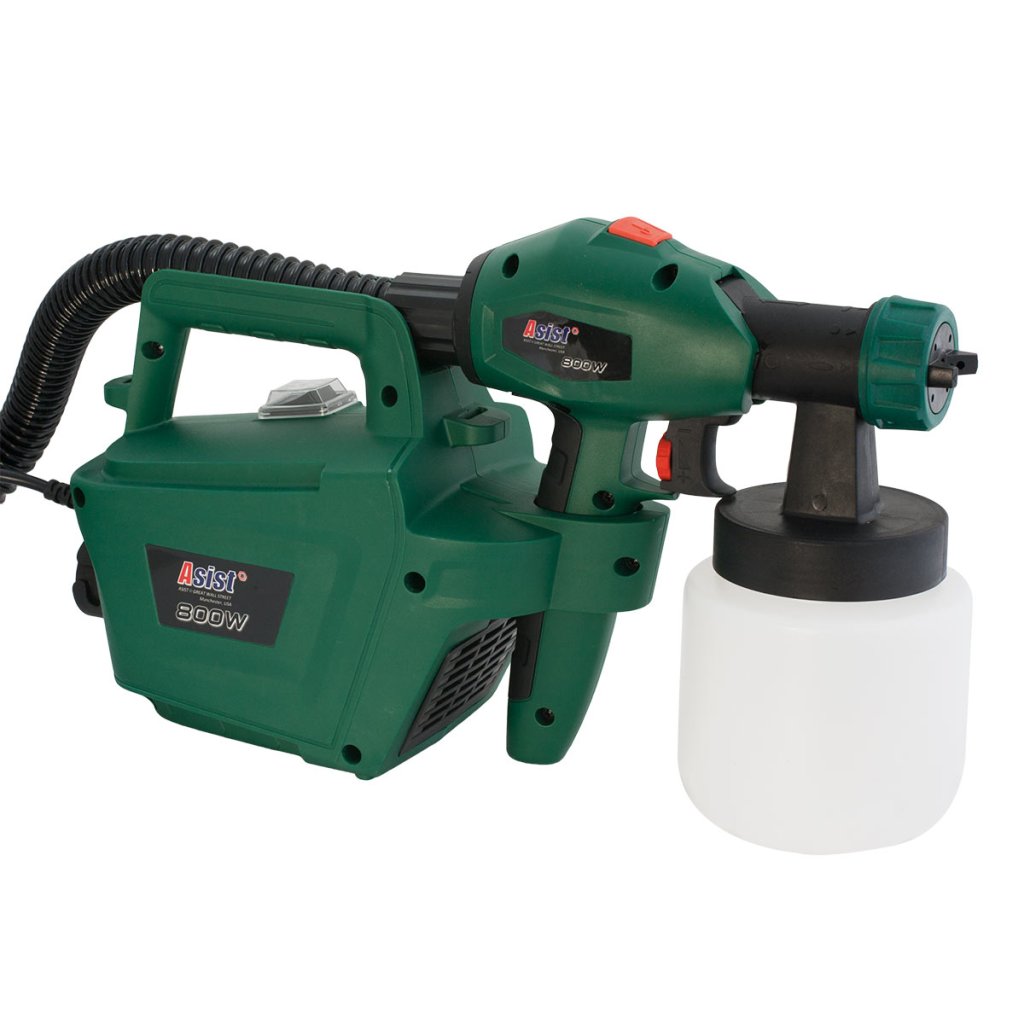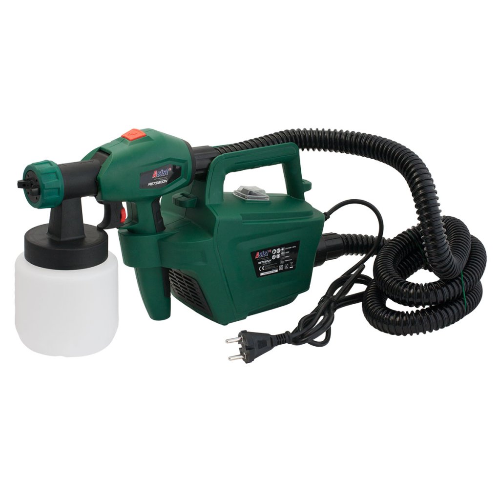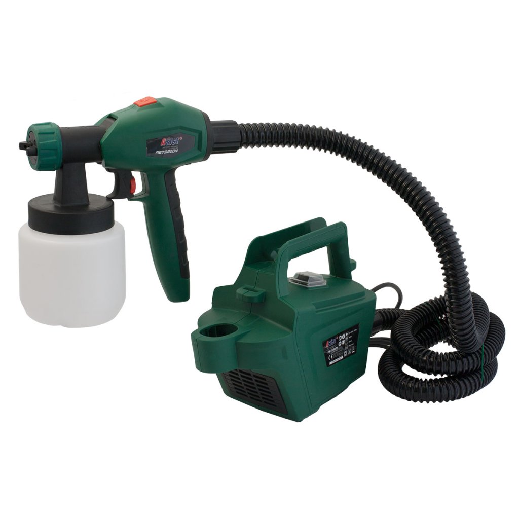 Elektrická stříkací pistole s regulací tvaru proudu a množství barvy. Nádržka na barvu má obsah 800ml. Rukojeť soft grip pro pohodlné držení i při déletrvající práci. vhodné na vodou i ředidlem ředitelné barvy, barvy na stěny na vodou a ředidlem ředitelné bary, laky, základy, dvojsložkové barvy, mořidla. Součástí je 1,8m dlouhá ohebná hadice, takže není nutno držet motor po celou dobu práce v ruce nebo zavěšený na rameni.