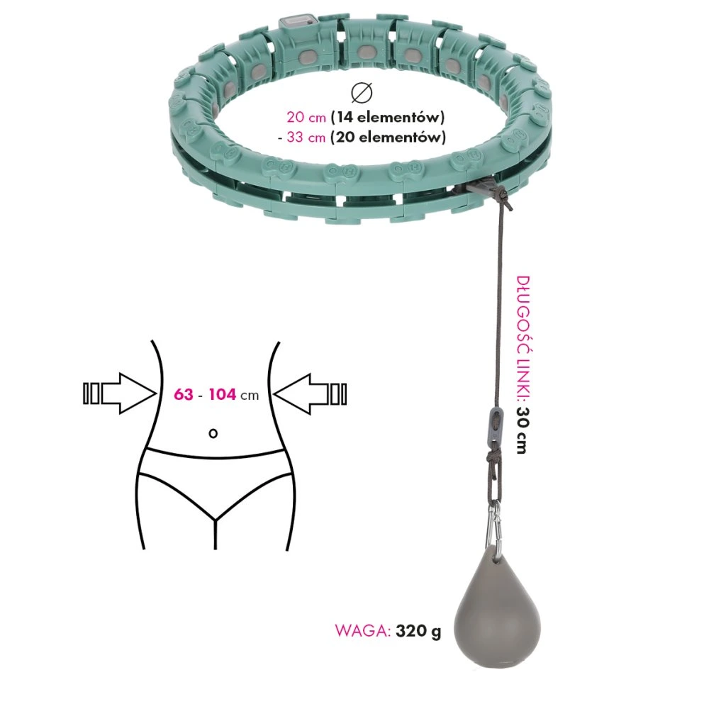 FH04 je hula hop obruč s nastavitelnou délkou, masážními výstupky a rotujícím závažím.