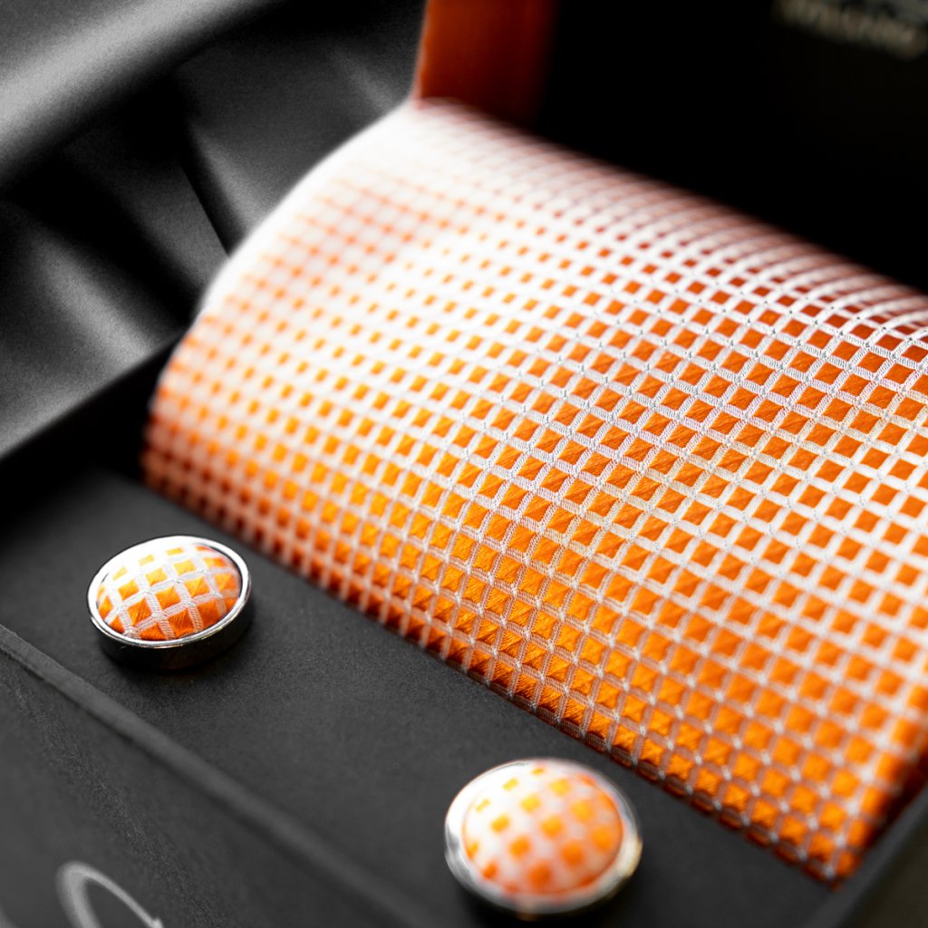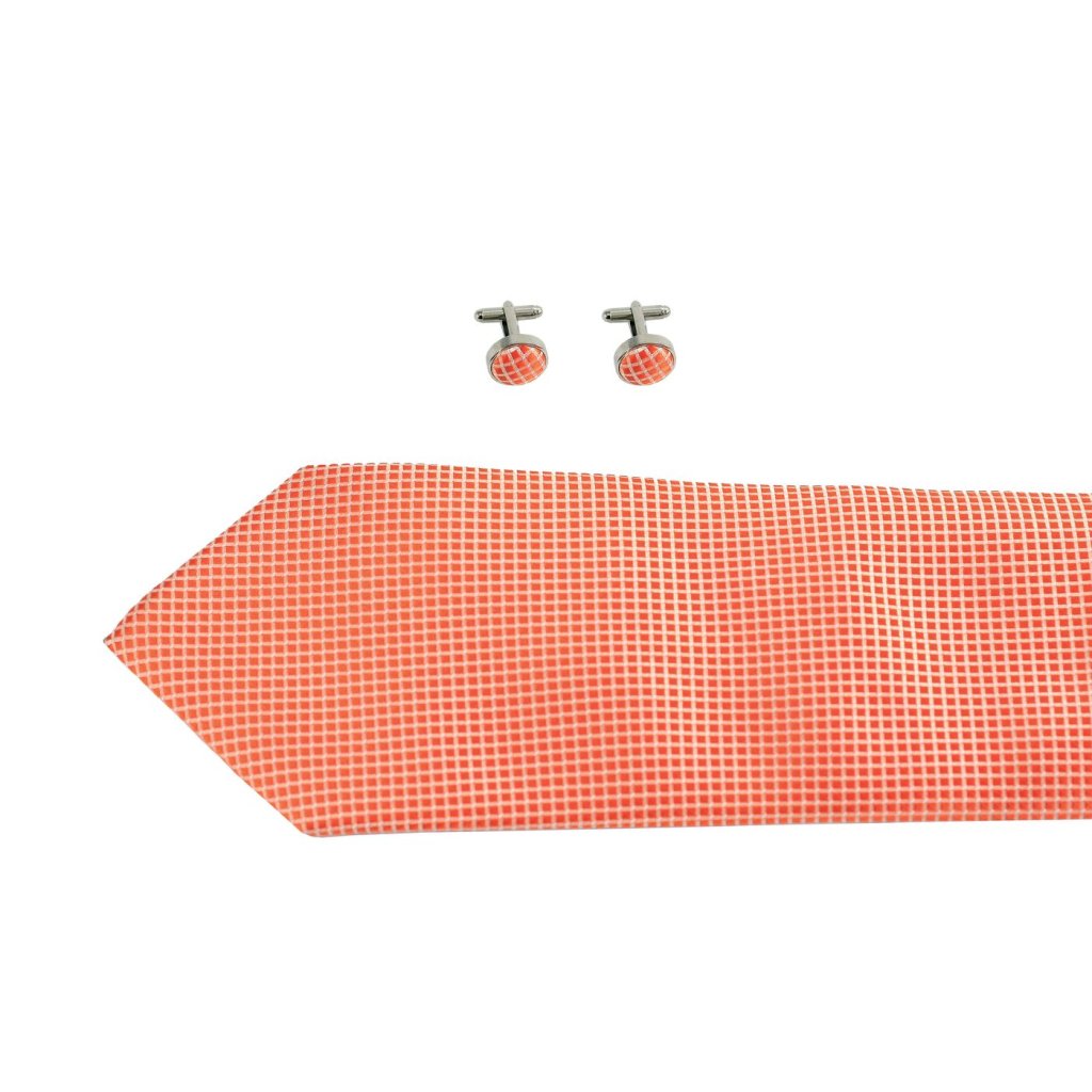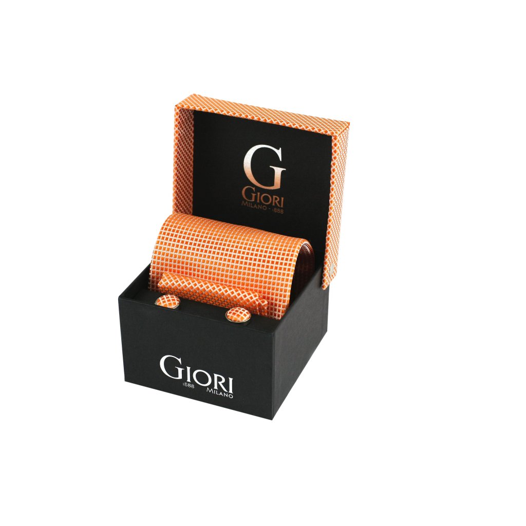 Luxusní sada Giori Milano: 100% hedvábná kravata, kapesníček a manžetové knoflíčky. Sytě meruňkové provedení s italským jemným kostkovým vzorem, baleno ve stejně designově laděném dárkovém balení.Doplňkové parametry