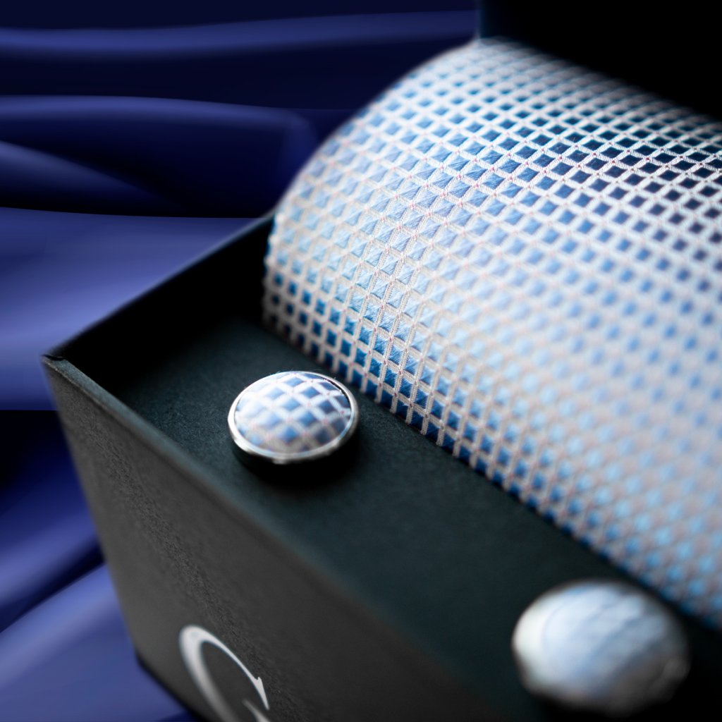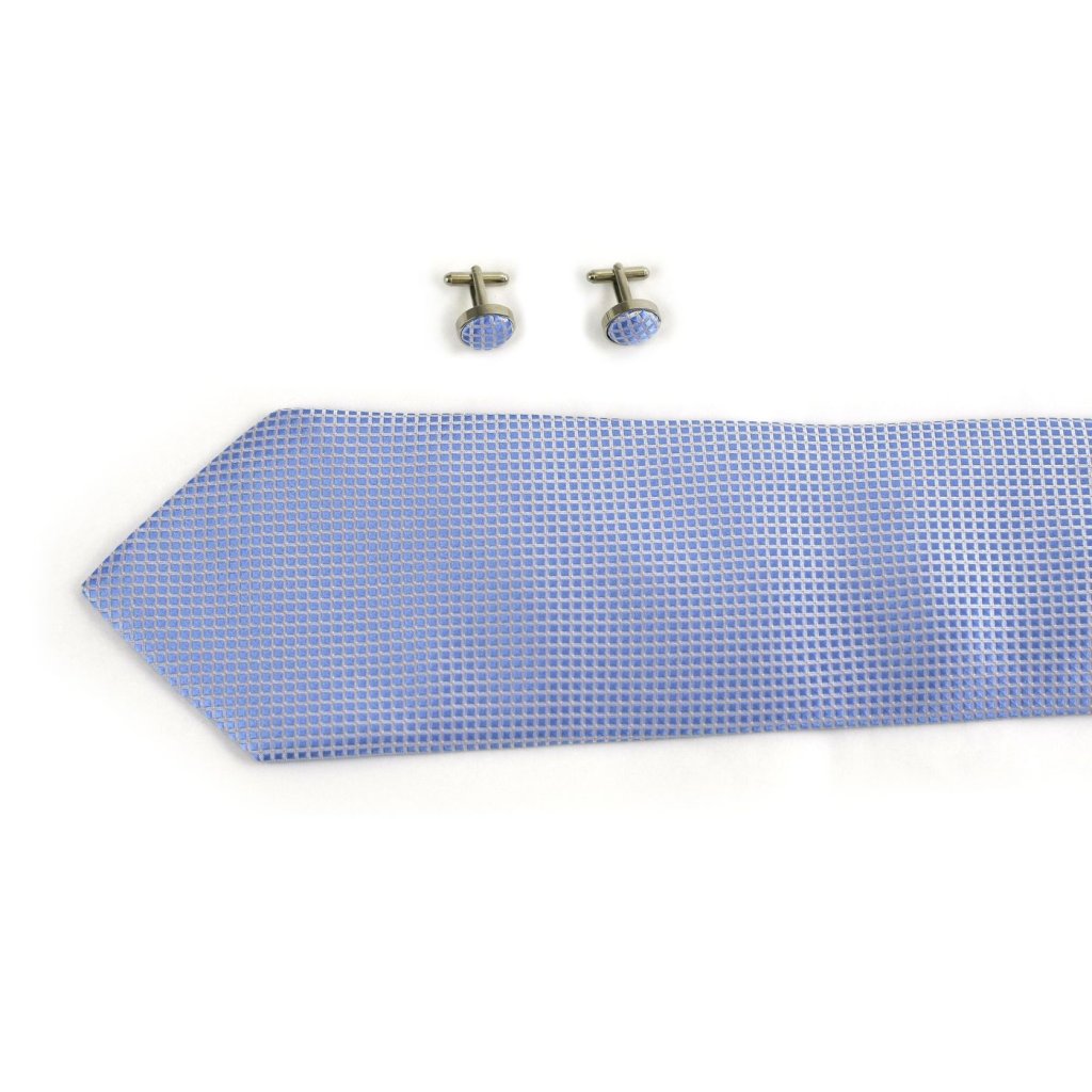 Luxusní sada Giori Milano: 100% hedvábná kravata, kapesníček a manžetové knoflíčky. Bledě modré provedení s italským jemným kostkovým vzorem, baleno ve stejně designově laděném dárkovém balení.Doplňkové parametry