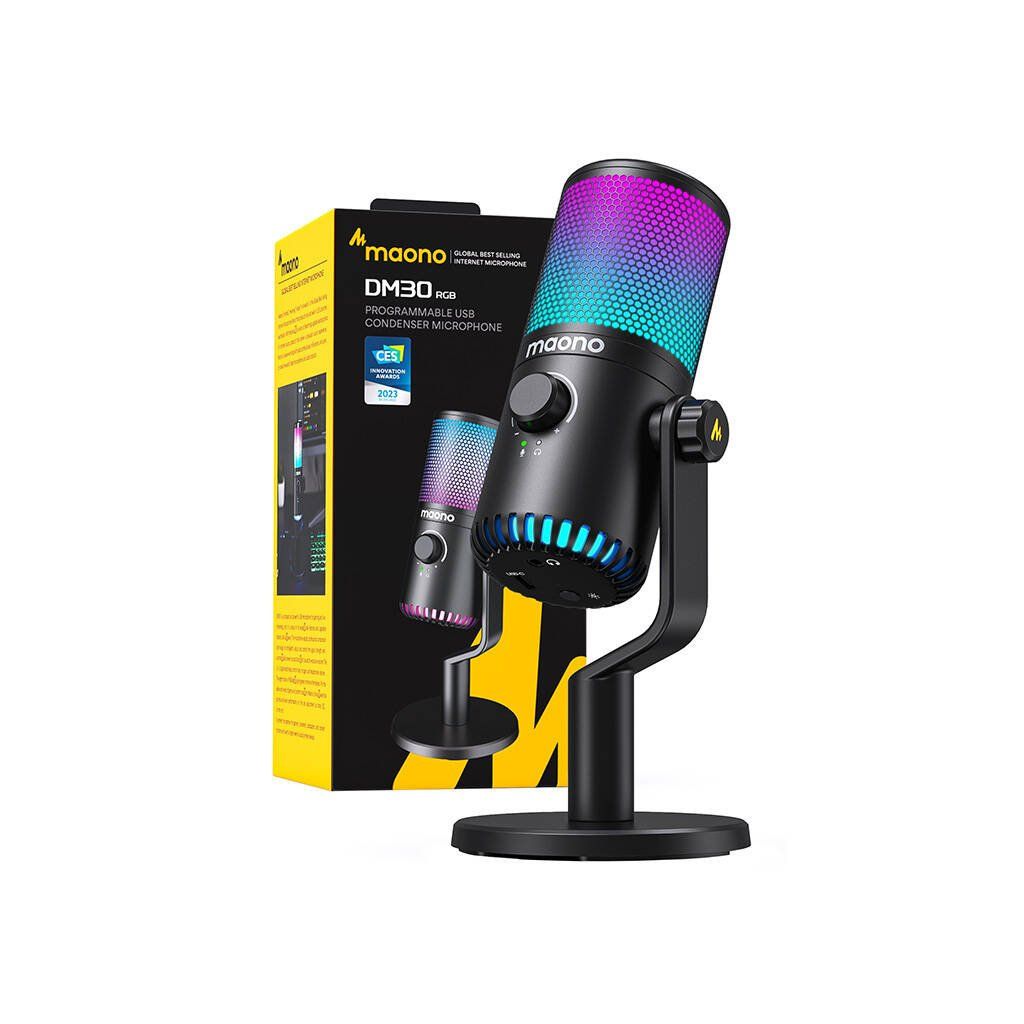 Maono DM30RGB je elegantní černý herní mikrofon navržený tak, aby poskytoval bezkonkurenční kvalitu zvuku při zachování estetického herního charakteru. Díky pokročilým možnostem přizpůsobení zvuku a osvětlení, pohodlnému ovladači hlasu a hlasitosti, integrovanému nastavení ekvalizéru a jednoduchosti Plug & Play je mikrofon DM30RGB ideální volbou pro herní nadšence a tvůrce obsahu. Funkčnost a styl, které se promítají do lepších herních a online komunikačních zážitků.