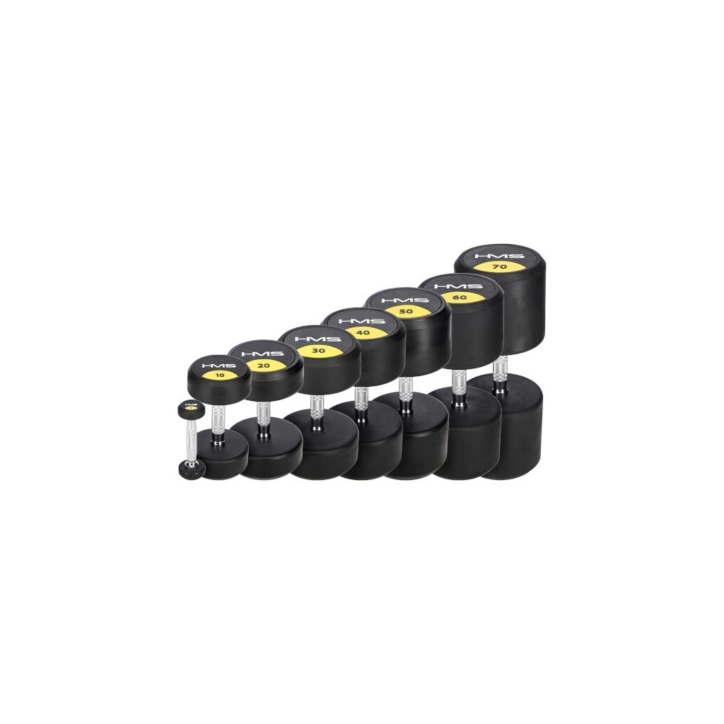 Profesionální jednoruční činka HMS HG Pro je vyrobena z litinového odlitku pokrytého silnou vrstvou gumy. Hmotnosti jsou dostupné v rozsahu od 1 do 70-ti kilogramů.