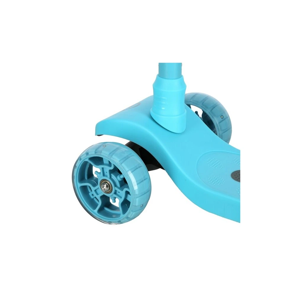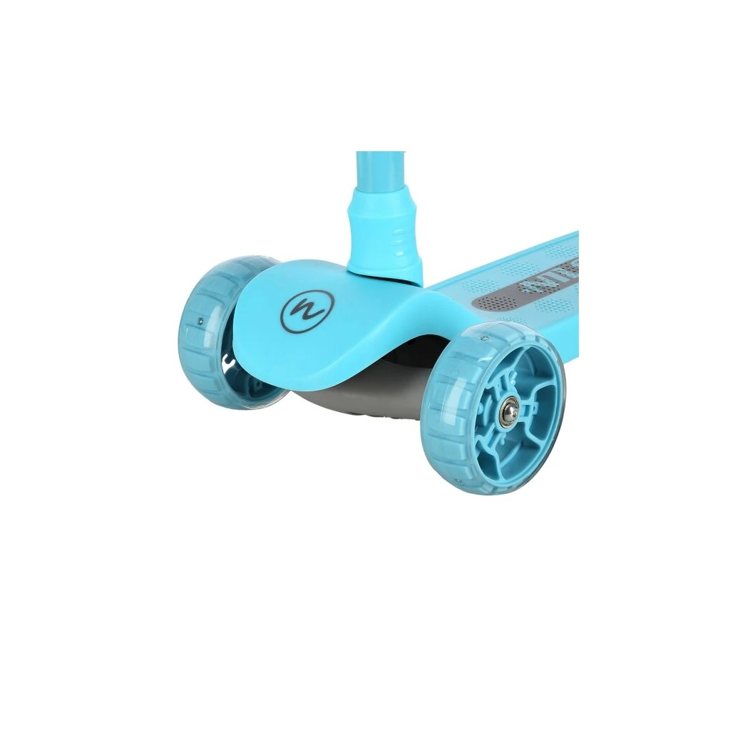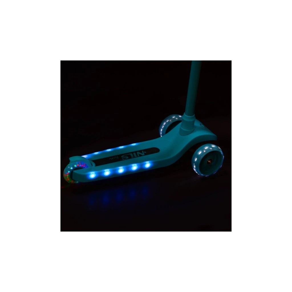 Přední kolečka o průměru 120 milimetrů jsou osazena bílími LED diodami, zadní kolečko o průměru 90 milimetrů diodami barevnými. Svítící LED diody slouží jako zajímavý, vizuální prvek, zvyšují zájem dětí a v neposlední řadě zvyšují viditelnost koloběžky například za šera. Kolečka svítí automaticky během jejich otáčení. Dále jsou kolečka osazeny ložisky ABEC 7 pro plynulou jízdu. Zadní blatník slouží jako nášlapná brzda pro bezpečné zastavení koloběžky.