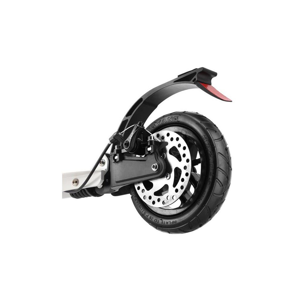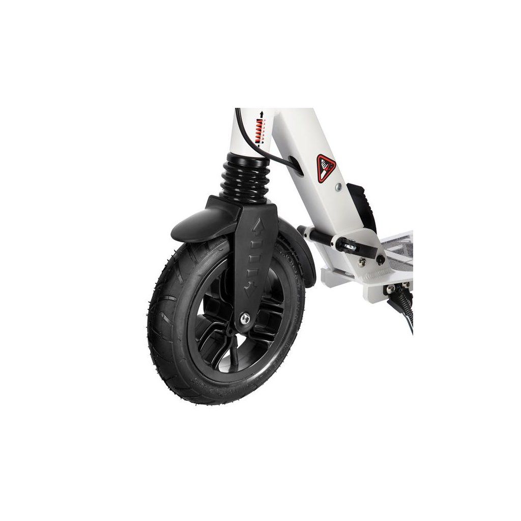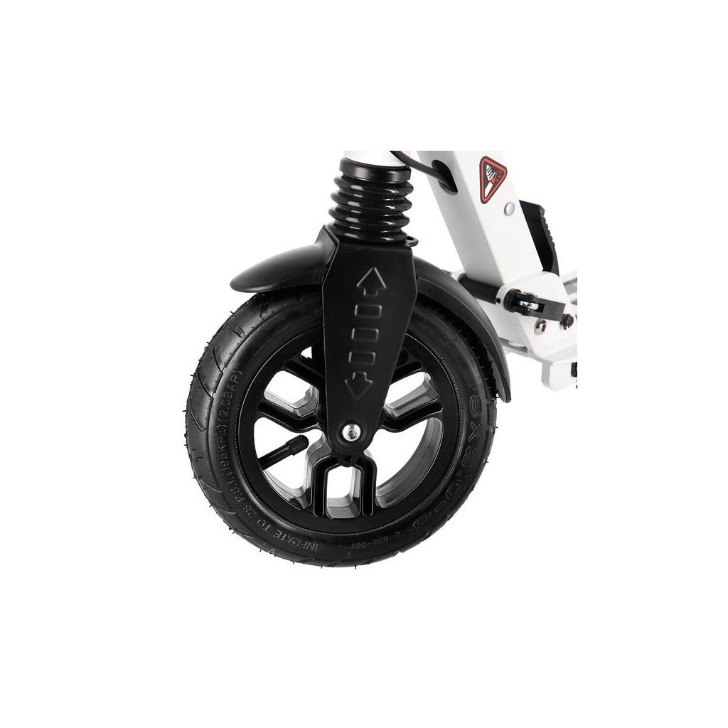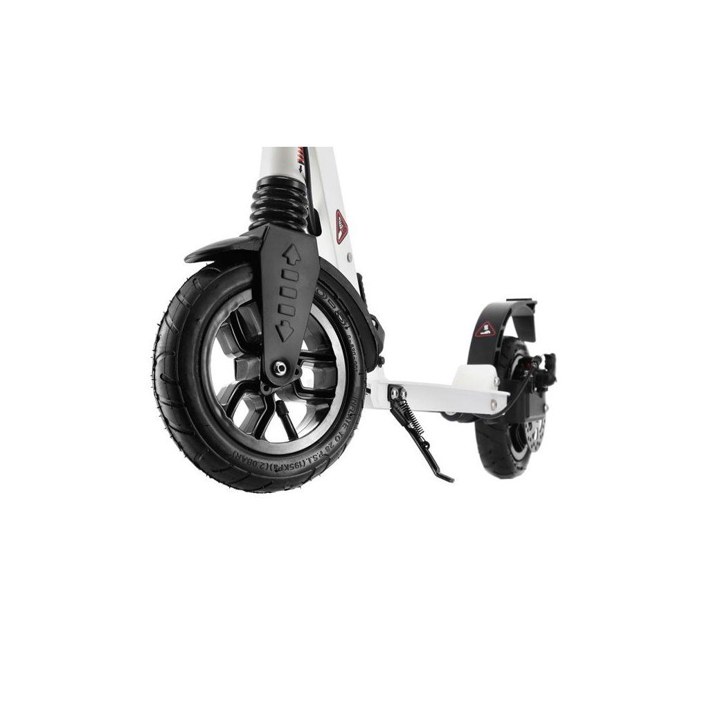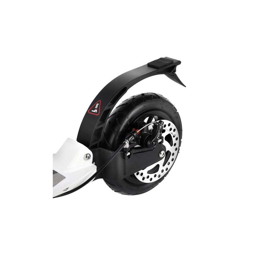 Systém odpružení obou kol zvyšuje jízdní komfort. Tlumiče pohlcují nárazy a jízda po nerovném asfaltu, nebo dlažebních kostkách je příjemnější a tižší. Robustní zadní blatník slouží jako přítlačná brzda, která ještě podtrhuje brzdný účinek kotouče. Samotný kotouč je bržděn jedním pístkem, který je mechanicky ovládaný lankem z páčky na řídítkách, ty jsou opatřeny gumovými rukojeťmi, které zajišťují pevný a pohodlný úchop. Velká kola jsou osazena ložisky ABEC 9 a pumpovanou pneumatikou o průměru 200 milimetrů. Tato kombinace zajišťuje rychlou, plynulou a bezpečnou jízdu. Pumpované pneumatiky navíc spolupracují s tlumiči a také pohlcují povrchové nerovnosti. Blatník na předním kole a skládací stojánek jsou již jen pomyslnou "třešničkou na dortu", která přizpívá k maximálnímu možnému komfortu z jízdy a k celkové radosti ze samotného použivání modelu MH208T.