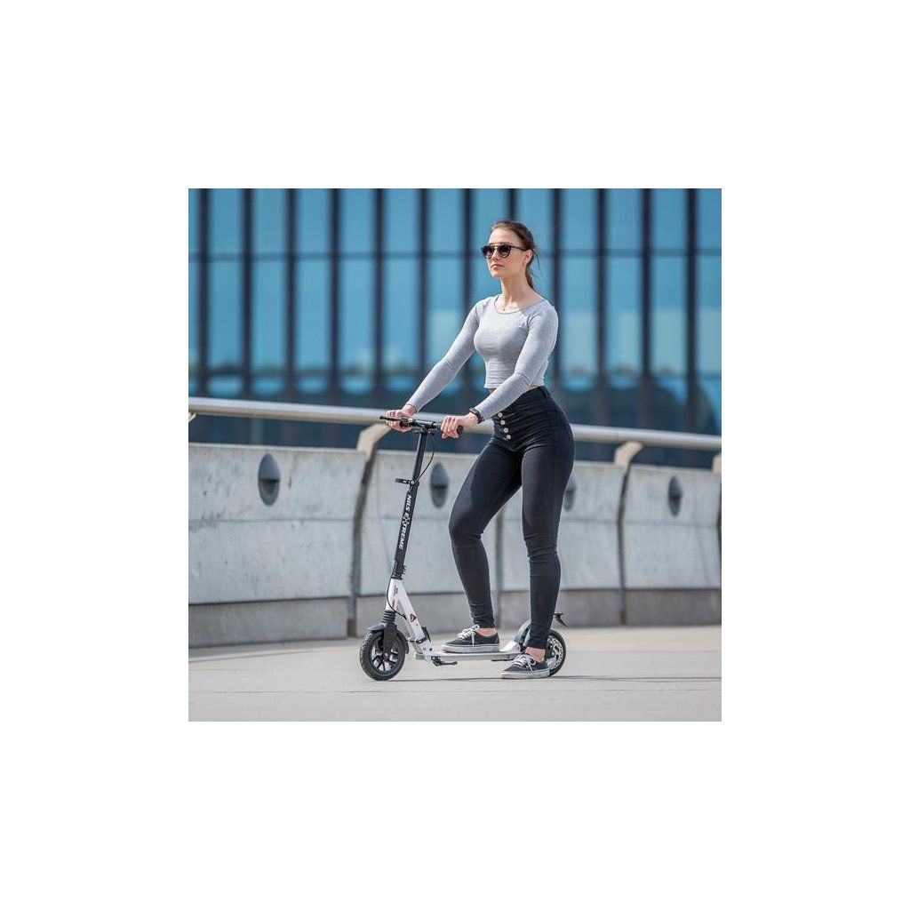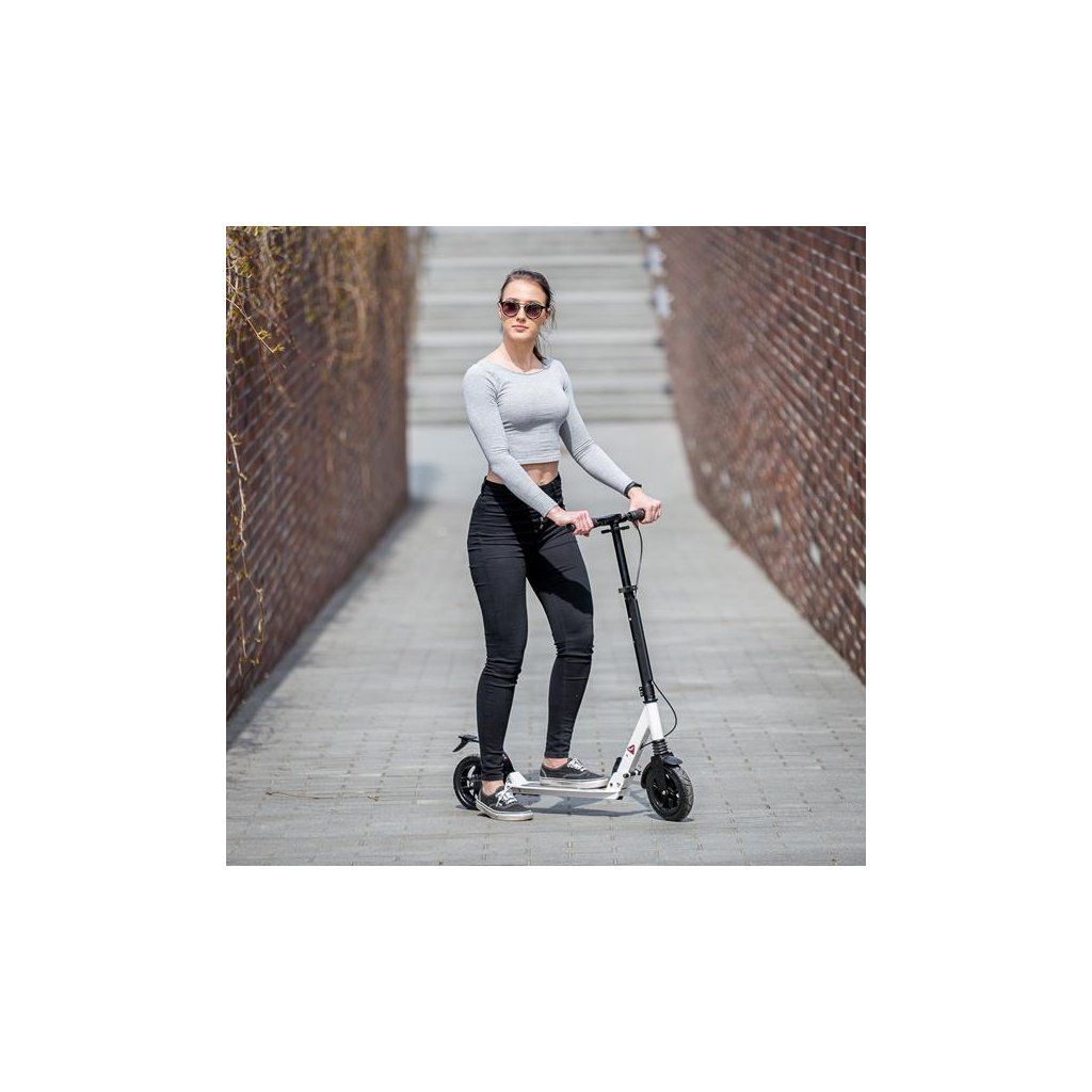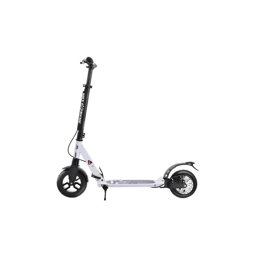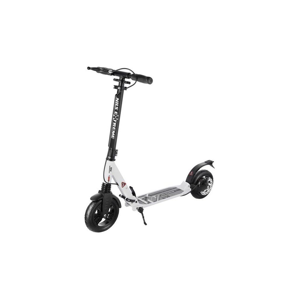 Koloběžka NILS Extreme HM208T je vhodná pro děti i dospělé. Charakteristikou modelu HM208T jsou tlumiče na předním i zadním kole a mechanická, kotoučová brzda.