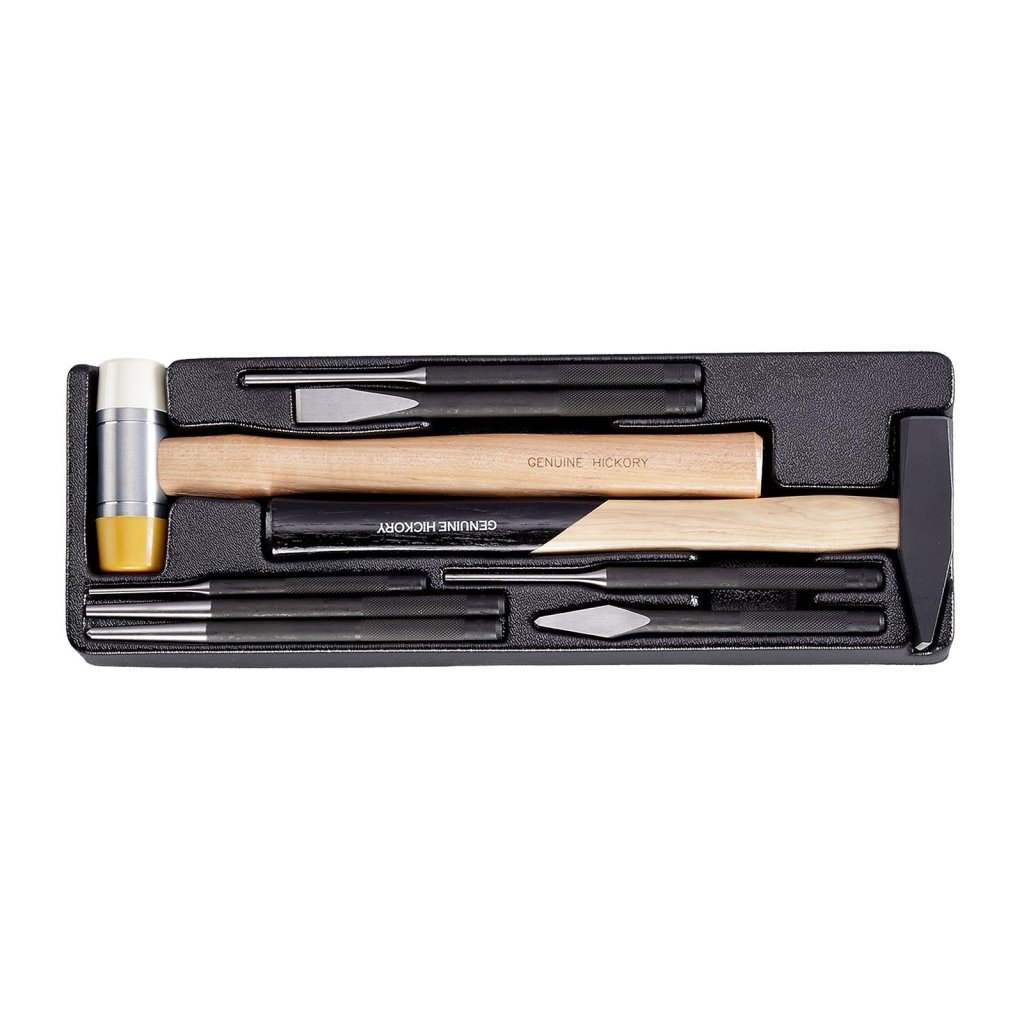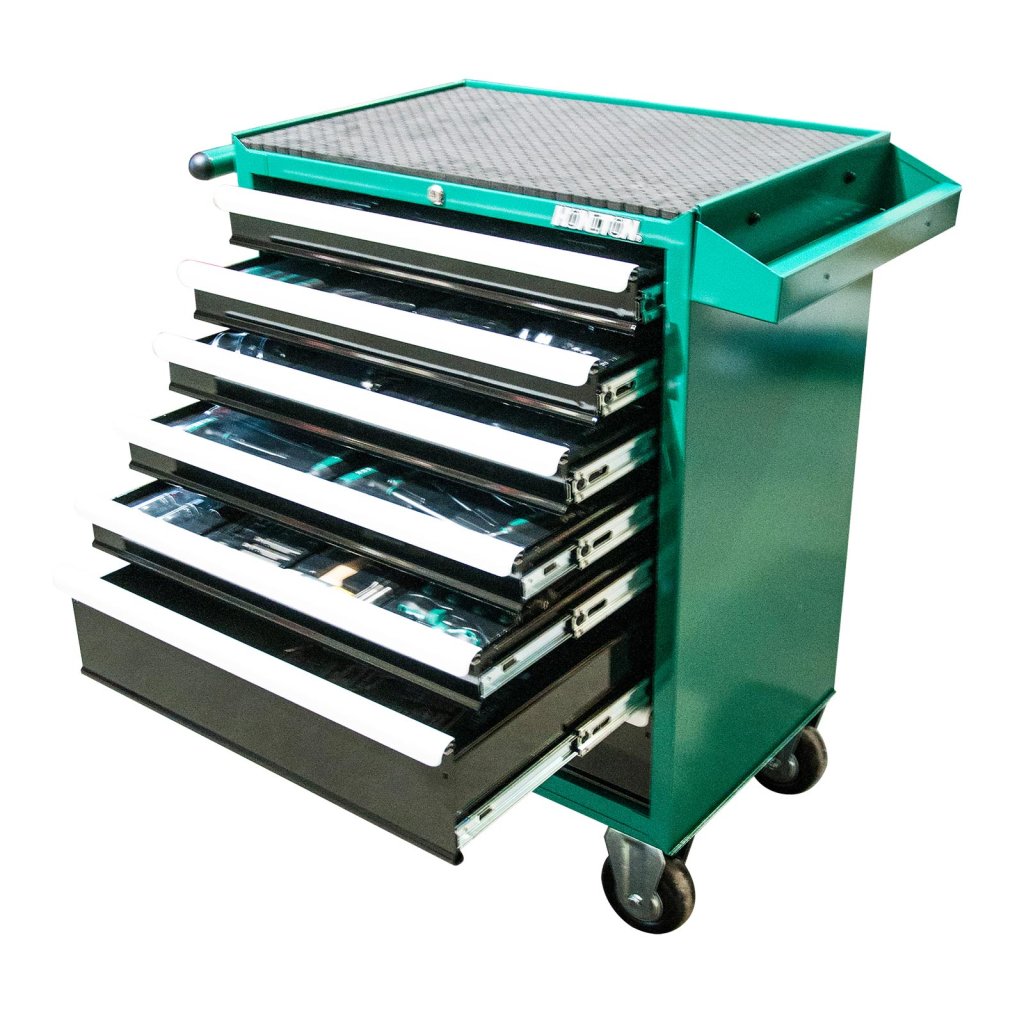 Kovový montážní vozík na nářadí se 7 zásuvkami. Dvě pevná a dvě otočná kola s poziční brzdou. Zásuvky s kuličkovými ložisky lze vysunout do 40 cm. Horní pracovní plocha i zásuvky jsou vypodloženy protiskluzovou podložkou. Držadlo pro manipulaci s vozíkem lze umístit z pravé i levé strany. Součástí je 5 nízkých a 2 vysoké uzamykatelné zásuvky.