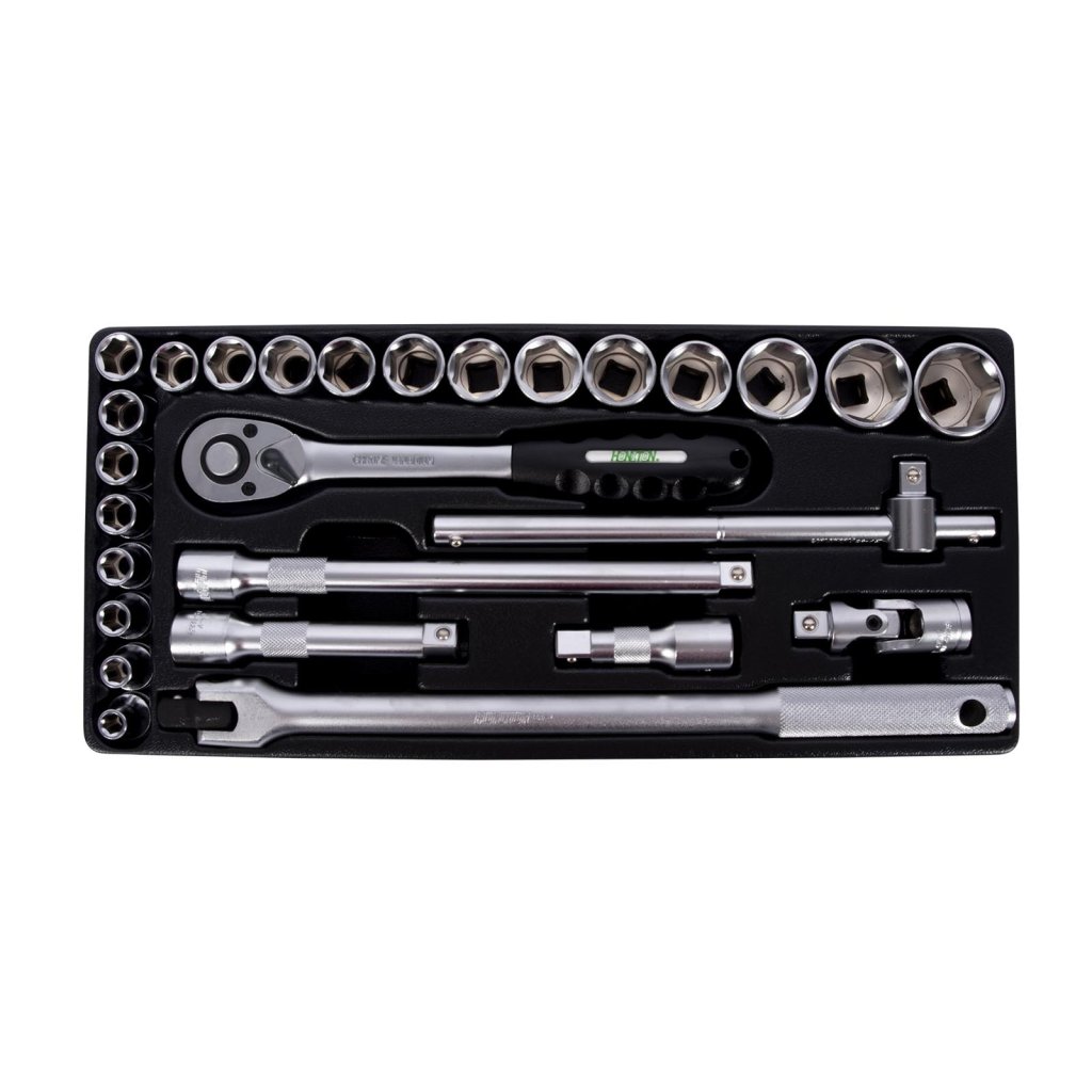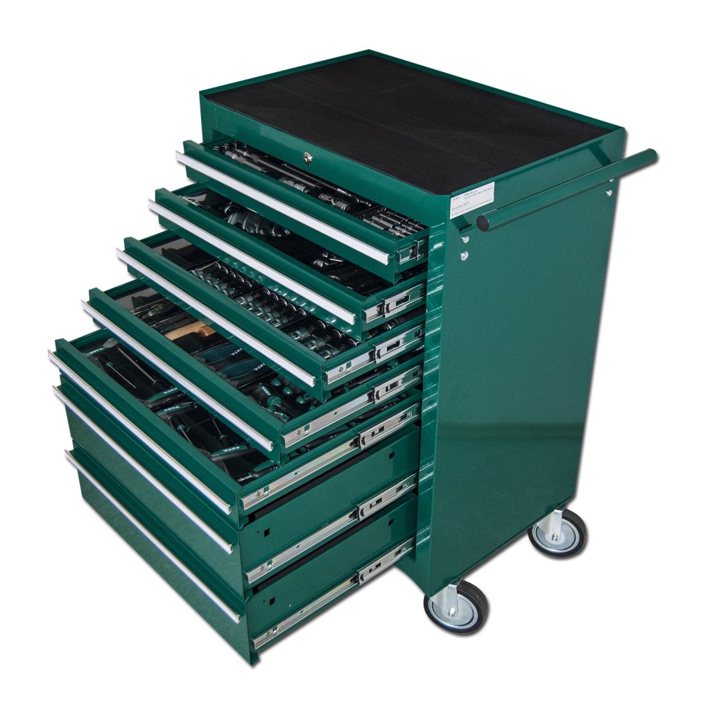 Kovový montážní vozík na nářadí se 7 zásuvkami. Dvě pevná a dvě otočná kola s poziční brzdou. Zásuvky s kuličkovými ložisky lze vysunout do 40 cm. Horní pracovní plocha i zásuvky jsou vypodloženy protiskluzovou podložkou. Držadlo pro manipulaci s vozíkem lze umístit z pravé i levé strany. Součástí je 5 nízkých a 2 vysoké uzamykatelné zásuvky.