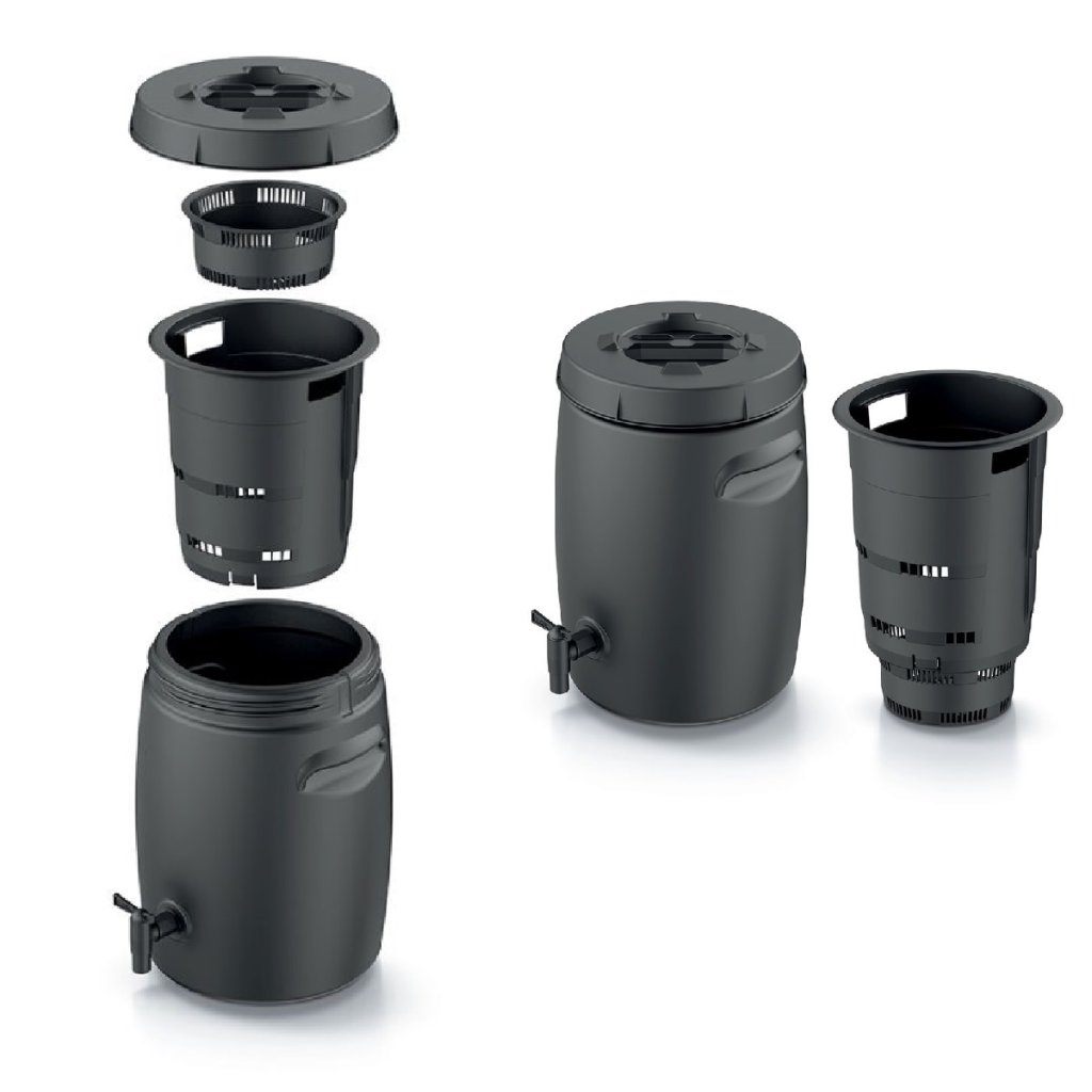 - Dvoukomorový systém: 55l sud s vodou + vyjímatelný filtr na organický materiál pro efektivní výrobu tekutého kompostu.