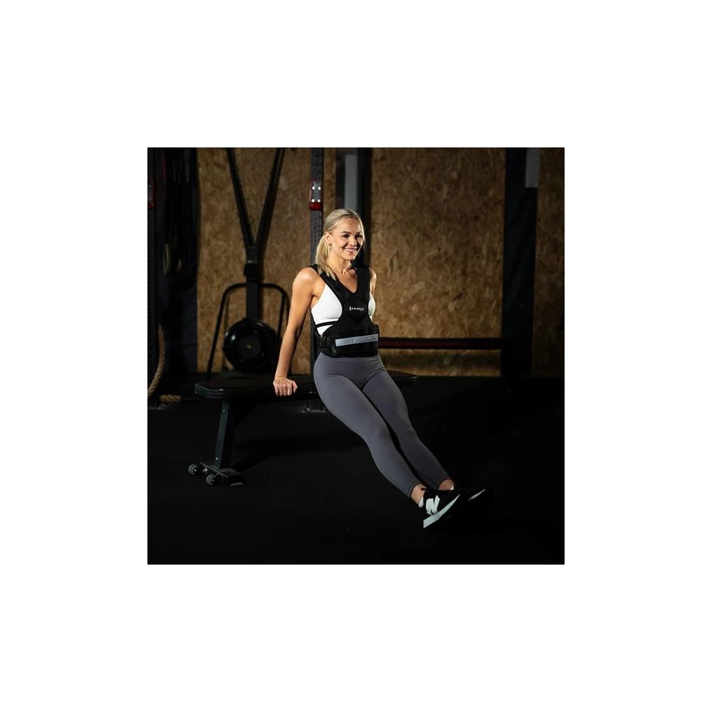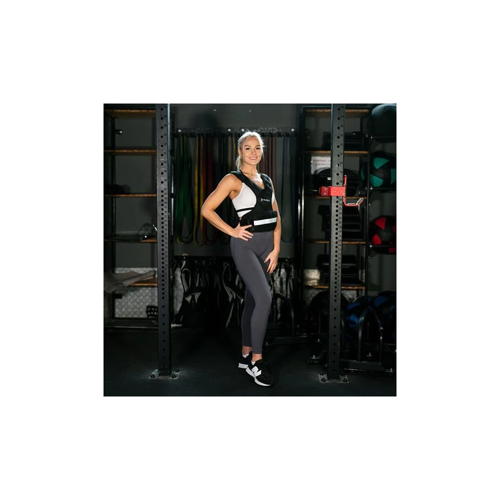 Vybavení bylo navrženo s ohledem na pohodlí uživatele. Regulovatelné popruhy umožňují dokonalé přizpůsobení jakékoliv postavě, a speciální neoprenový materiál je měkký, odolný proti potu a zabraňuje sklouzávání vesty i při intenzivních pohybech. Elastická síťovaná kapsa poskytuje prostor pro uložení telefonu, klíčů nebo peněženky, díky čemuž se trénink stává ještě praktičtějším.