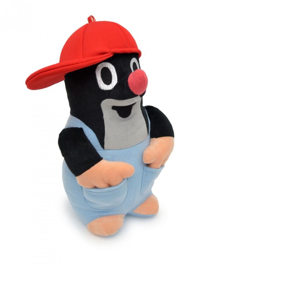 Plyšový Krteček v kalhotkách s kapsami a sundavací kšiltovkou.