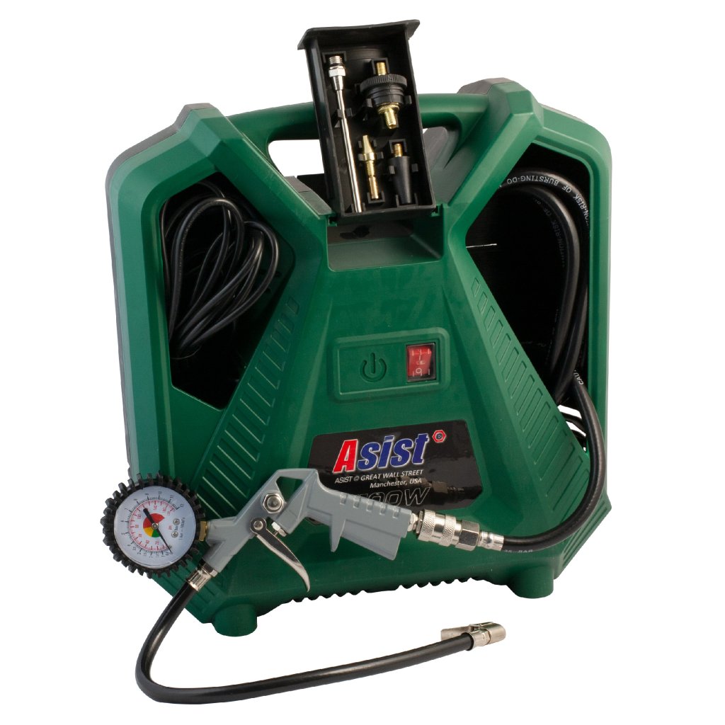 Malý mobilní kufříkový kompresor Asist s příkonem 1100 W s provozním napětím 230V je bezolejový kufříkový kompresor s příslušenstvím Tento kompresor pracuje s tlakem až 8 bar a dodává až 180 litrů vzduchu za minutu. Kufříkový kompresor je vhodný jako přívod stlačeného vzduchu pro zařízení na huštění pneumatik, ofukovací pistole, nanášení barev, nýtovací, hřebíkovací a sponkovací nářadí. Za použití nástavců také na dofukování balonů, bazénů a nafukovacích člunů.