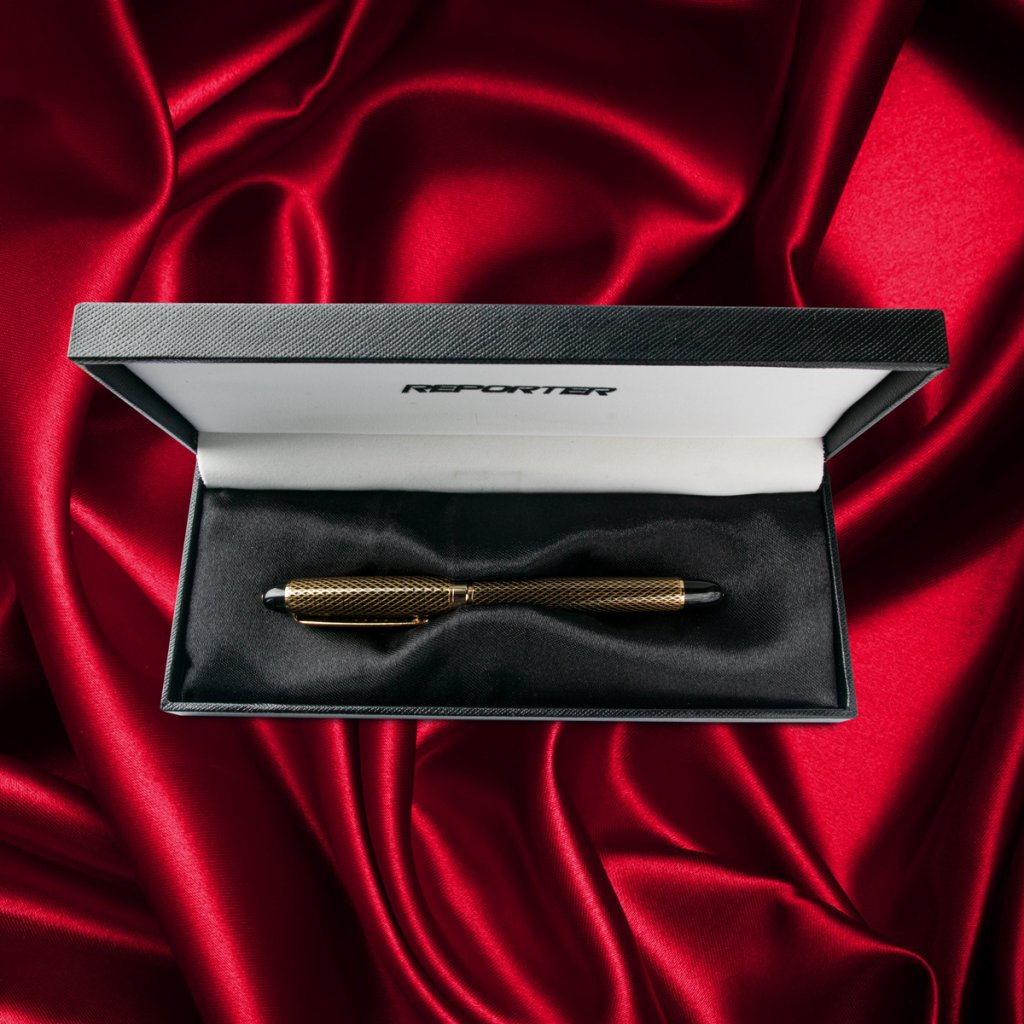 Luxusní kuličkové pero od výrobce Reporter v barevné kombinaci černé a zlaté. Tělo pera je vyrobeno z mědi a váží 33g. Délka je 133 mm a je plněno originální náplní Reporter (jedná se o mezinárodně používanou). Pero je zabaleno v originální dárkové černé kazetě se stříbrným logem.