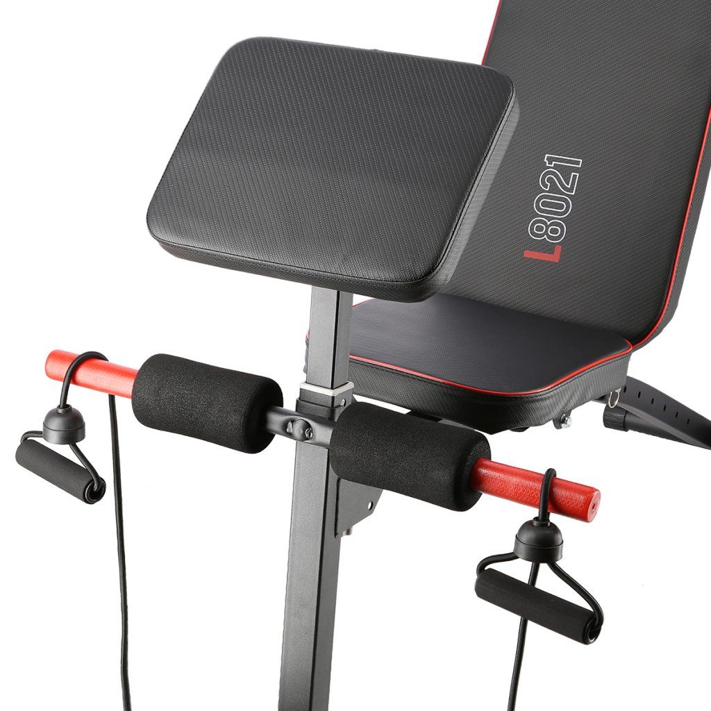 Ocelová konstrukce má nosnost 150 kilogramů a lze ji snadno složit, takže nezabere mnoho místa, pokud lavici zrovna nepoužíváte. Hmotnost L8021 je 9,5 kilogramů. Sedák a opěry jsou potaženy odolnou, syntetickou kůží s neklouzavým povrchem. Zádová opěra je nastavitelná do 7-mi poloh v rozsahu od -20° do 90°. Bicepsovou opěru je možné výškově nastavit do 2 poloh. Stabilizátory lavice jsou osazeny gumovými koncovkami, které lavici udrží pevně na svém místě. Na přední noze se nacházejí poutka k zaháčení dodávaných gumových lan pro trénink paží.