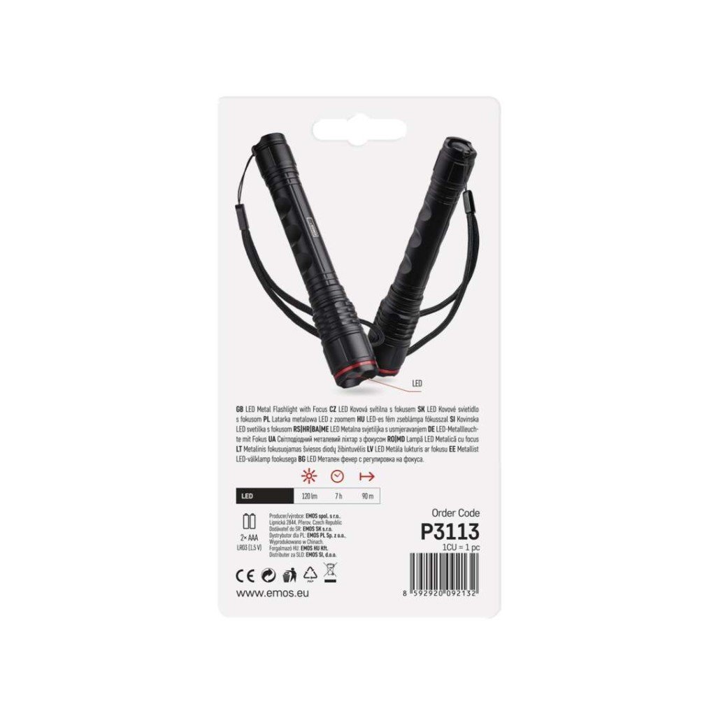 ** Ostatní parametry ** baterie součástí balení:ne nabíjecí: ne typ baterie:LR03 (1,5 V) fokus: ano voděodolnost:ano (IP44) materiál: hliník doba svícení:7 h doba svícení detail : LED 100 % – 7 h doba nabíjení: neuvádí se nárazuvzdornost:ano barva:černá světelný tokLED: 100 % – 120 lm zdroj světla:LED dosvitLED: 100 % – 90 m počet režimů svícení: 1 typ napájecího konektoru: neuvádí se LED indikace stavu akumulátoru:neuvádí se režimy svícení:LED 100 % LED indikace nabíjení: neuvádí se příslušenství: neuvádí se speciální funkce: neuvádí se vybavení: poutko hmotnost:48 g záruční doba: 2 roky rozměr:131 × 21 × 21 mm prodejní obal: 1 ks, papírový blistr značka: EMOS