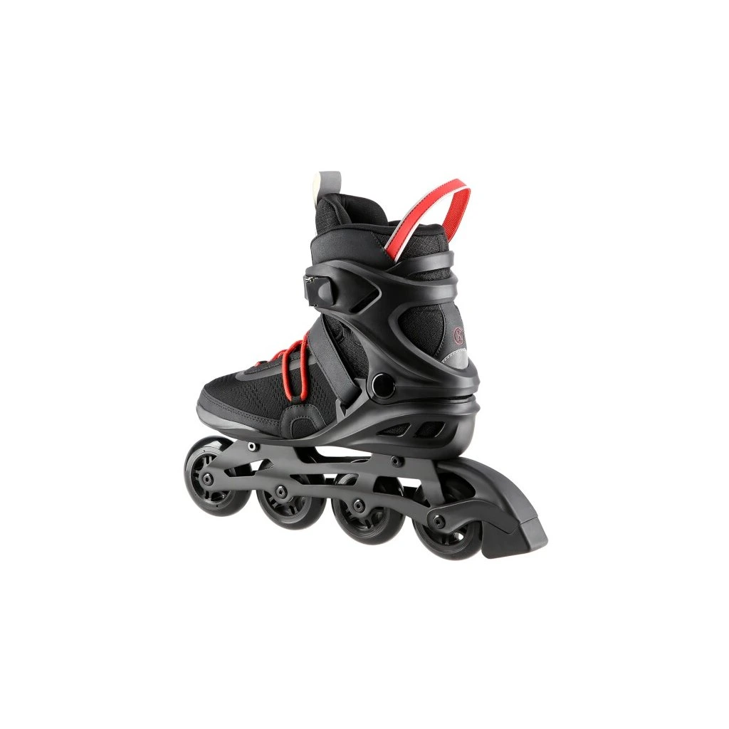 Hliníkový podvozek je osazen PU kolečky o průměru 80 milimetrů. Tvrdost koleček je 82A, ta je ideálním kompromisem mezi rychlostí, životností a pohodlím. Kolečka jsou osazena ložisky ABEC 7 pro svižnou a plynulou jízdu. Skelet brusle je vyroben z polypropylenu, který dobře přenáší energii z odrazu na kolečka a zároveň vydrží i připadný pád. Pohodlná, poloměkká bota je vyrobena z kombinace semiše, síťoviny MESH - pro dobrou prodyšnost, EVA a pěny o vysoké hustotě. Vnitřní bota nemá krytou špičku, takže dobře větrá a noha se méně potí. Zapínání je řešeno klasickou trojkombinací - šněrování, řemínek se suchým zipem a dvousekční přezka. Pravá brusle je osazena brzdou.
