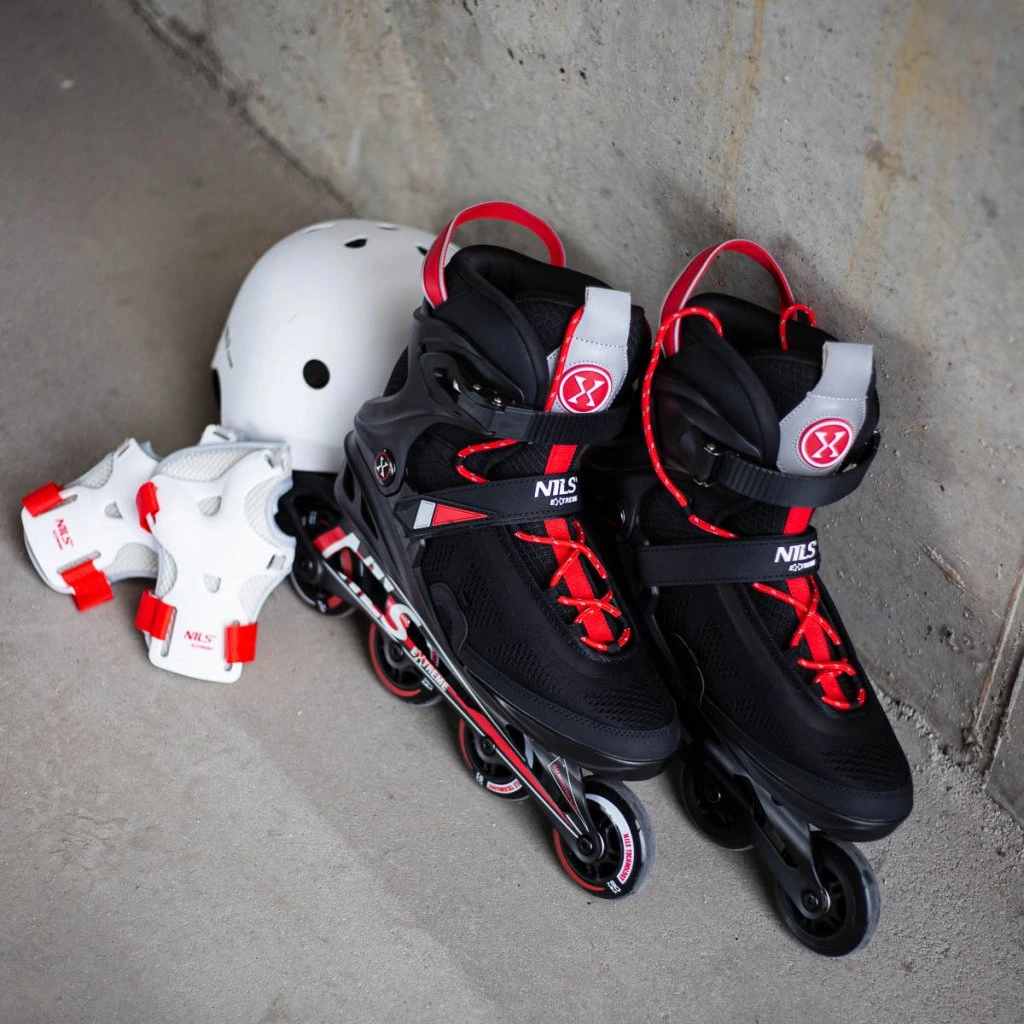 Kolečkové brusle NILS Extreme NA14124 jsou určeny k rekreačním projížďkám pro začínající a středně pokročilé bruslaře. Kolečka PU 80/82A, ložiska ABEC 7, zapínání na řemínek se suchým zipem, dvousekční přezku a šněrování.