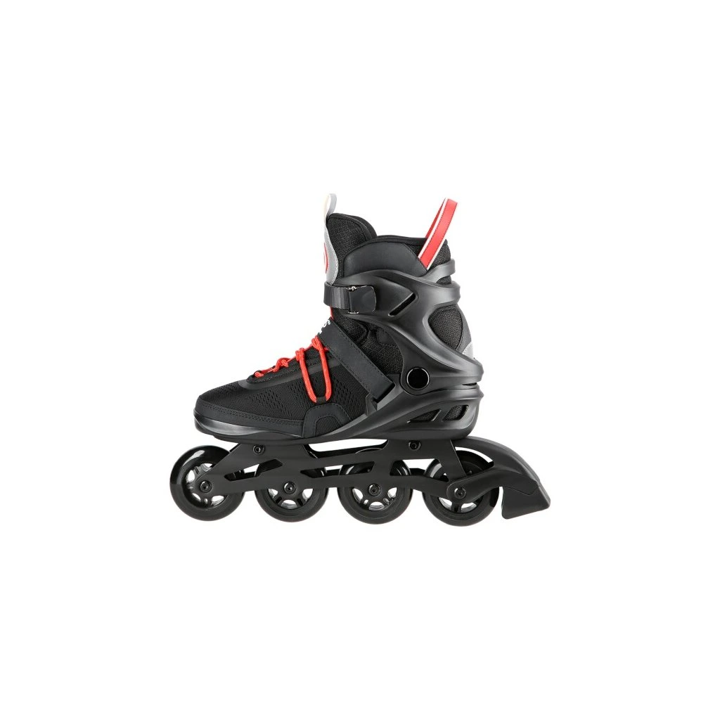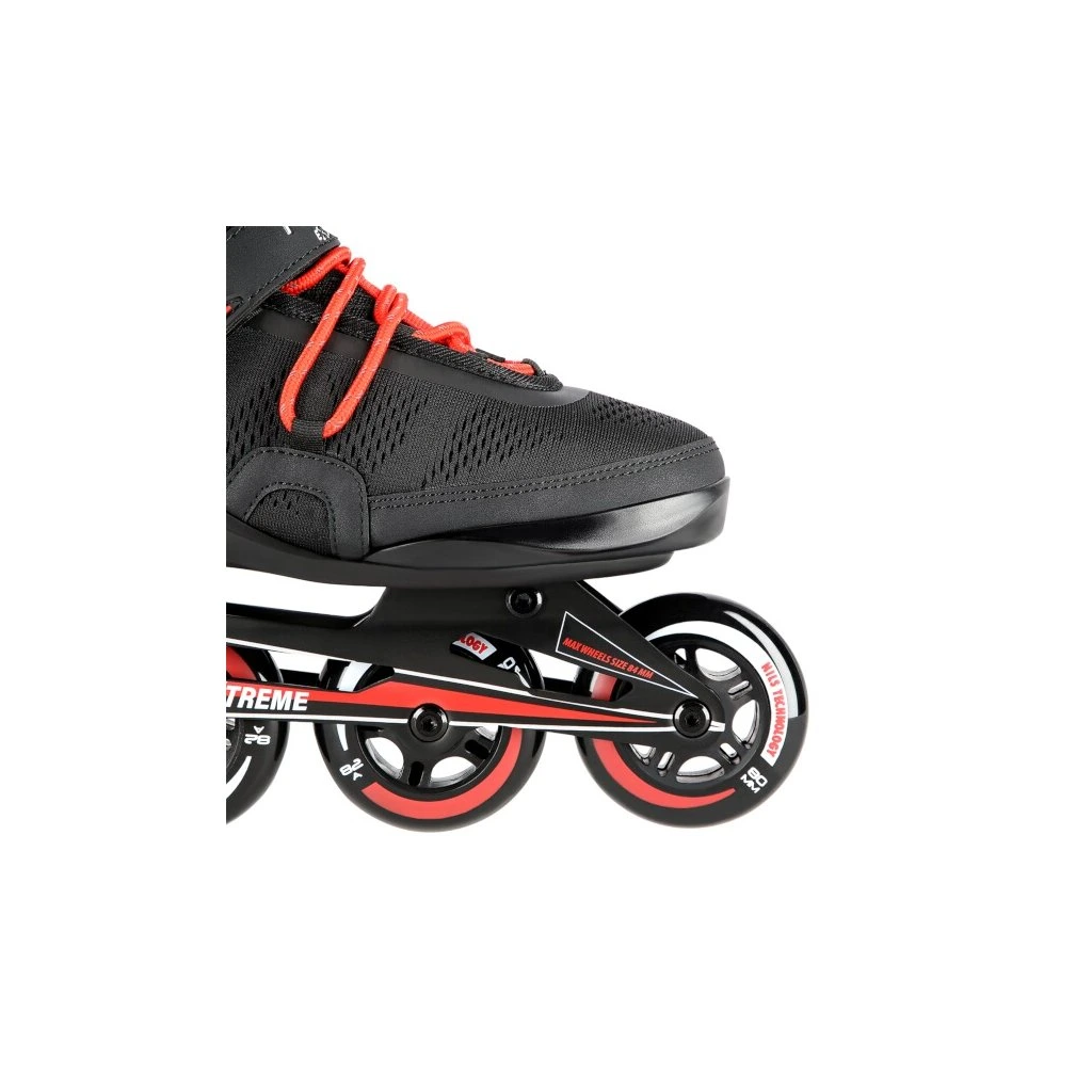 Hliníkový podvozek je osazen PU kolečky o průměru 80 milimetrů. Tvrdost koleček je 82A, ta je ideálním kompromisem mezi rychlostí, životností a pohodlím. Kolečka jsou osazena ložisky ABEC 7 pro svižnou a plynulou jízdu. Skelet brusle je vyroben z polypropylenu, který dobře přenáší energii z odrazu na kolečka a zároveň vydrží i připadný pád. Pohodlná, poloměkká bota je vyrobena z kombinace semiše, síťoviny MESH - pro dobrou prodyšnost, EVA a pěny o vysoké hustotě. Vnitřní bota nemá krytou špičku, takže dobře větrá a noha se méně potí. Zapínání je řešeno klasickou trojkombinací - šněrování, řemínek se suchým zipem a dvousekční přezka. Pravá brusle je osazena brzdou.