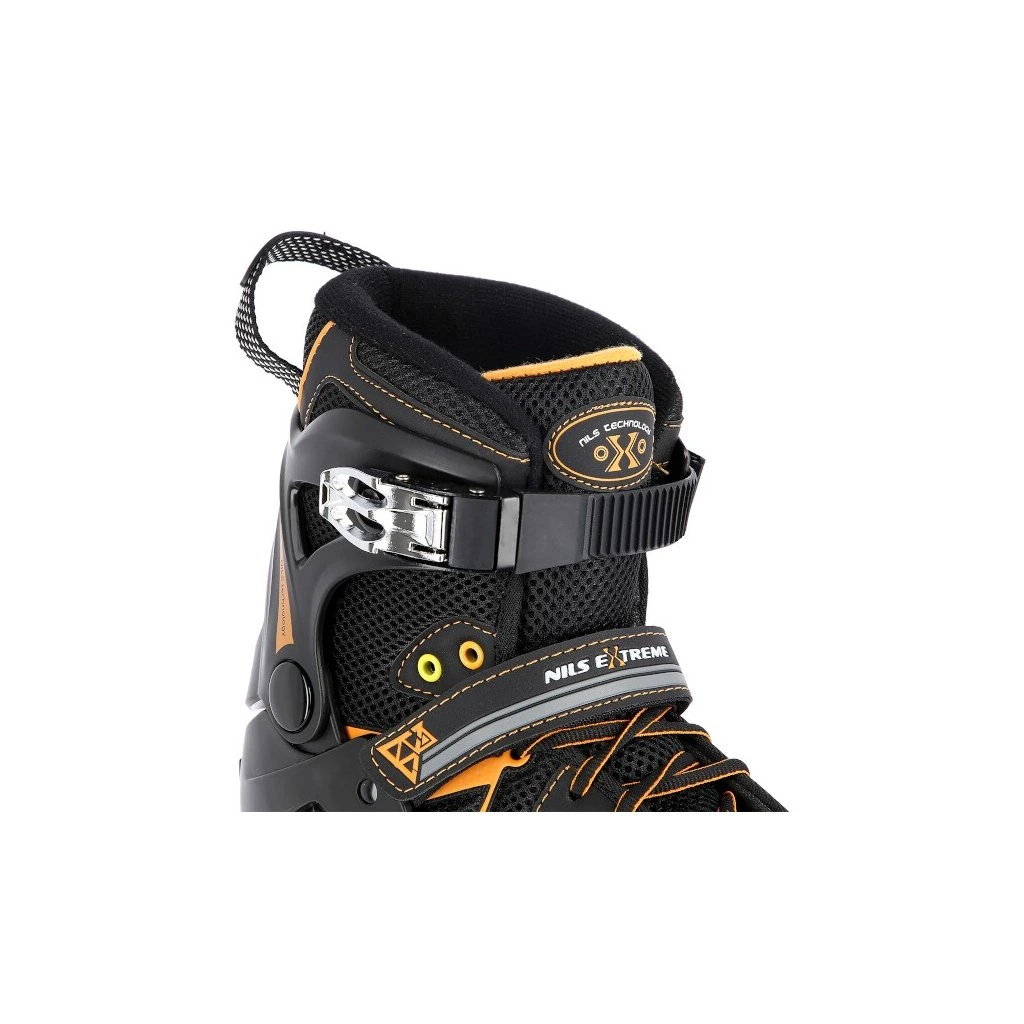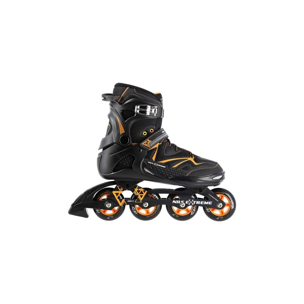 Kolečkové brusle NILS Extreme NA9022 jsou určeny k rekreační jízdě středně pokročilých a pokročilých bruslařů po rovných a hladkých stezkách, jako například po asfaltu.Lehká a odolná bota je vyrobena z kombinace síťoviny MESH a pěny EVA, špička je vybavena ventilačními otvory, tyto vlastnosti zaručují prodyšnost boty, snižují pocení nohy a předchází tak vlhnutí vložky. Systém ventilace a tvarovaná stélka boty tak přímo ovlivňují zvýšení uživatelského komfortu. Sketel modelu NH9022 je vyroben z polypropylenu, který je velice odolný a vydrží i ty nejtvrdší pády, zároveň stabilizuje chodidlo v oblasti kotníku. Bezpečnost brusle zvyšuje zapínání na dvousekční přezku, řeminek se suchým zipem a šněrování.80-ti milimetrová kolečka s tvrdostí 82A jsou uložena v hliníkové liště vyrobené precizní CNC technologií, dobře přiléhají k podkladu a částečně pohlcují nervnosti. Model NA9022 je osazen ložisky ABEC 9, která se vyznačují precizním zpracováním a nízkým odporem, kdy jízda má dobrou setrvačnost a na bruslích tak lze dosáhnout vysoké rychlosti, nebo urazit dlouhou vzdálenost bez vynaložení zbytečné síly.