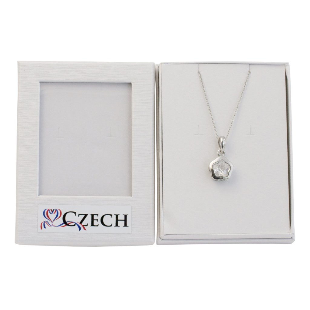Výrazný a nadčasový doplněk, který rozzáří každý outfit. Přívěsek ve tvaru květiny je zavěšen na jemném řetízku a zdoben brilantně třpytivým českým krystalem. Povrchová úprava pokovením rhodiem zajišťuje dlouhotrvající lesk a lepší odolnost proti oxidaci, zatímco antialergenní slitina cínu bez niklu a olova je šetrná i k citlivé pokožce. Vynikne jak při každodenním nošení, tak u slavnostních příležitostí.