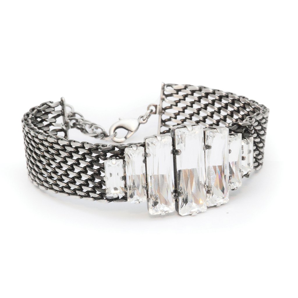 Náramek z bižuterního kovu který je osazen 7 krystaly Made with Swarovski crystals. Rozměr krystalů na náramku je 2,5 x 4,5 cm. Odstín náramku - starostříbro.