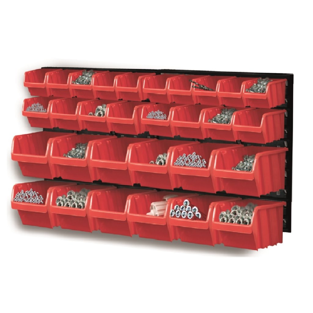 Nástěnný organizér značky Prosperplast se skládá ze dvou tabulí velikosti 80 x 40 centimetrů a 30 plastových boxů v červeném barevném provedení. Slouží k uskladnění šroubků, matic, podložek a jiných drobností. Ideální do dílny či garáže.