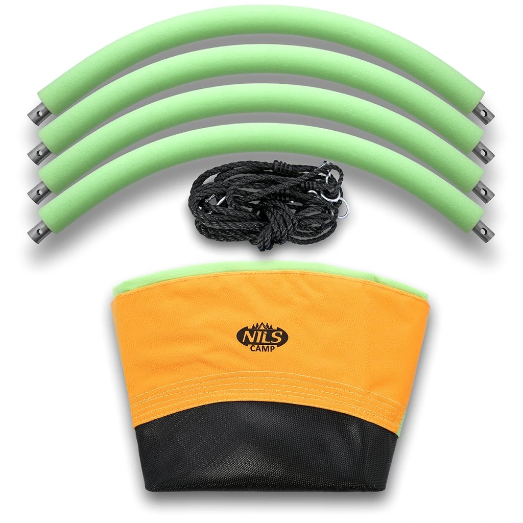 Kruhová houpačka NILS Camp NB5003 je vhodná pro použití venku. Hnízdo je vhodné jak pro houpání, tak pro odpočinek a díky průměru 90 cm a nosnosti až 150 kg se do něj pohodlně vejdou dvě děti. Houpačku drží 4 PE lana o délce 180 cm. Samotná konstrukce hnízda je tvořena 25 mm širokým, ocelovým kruhem, který je chráněn vrstvou mirelonu a přes něj je natažena polyesterová tkanina Oxford 600D.