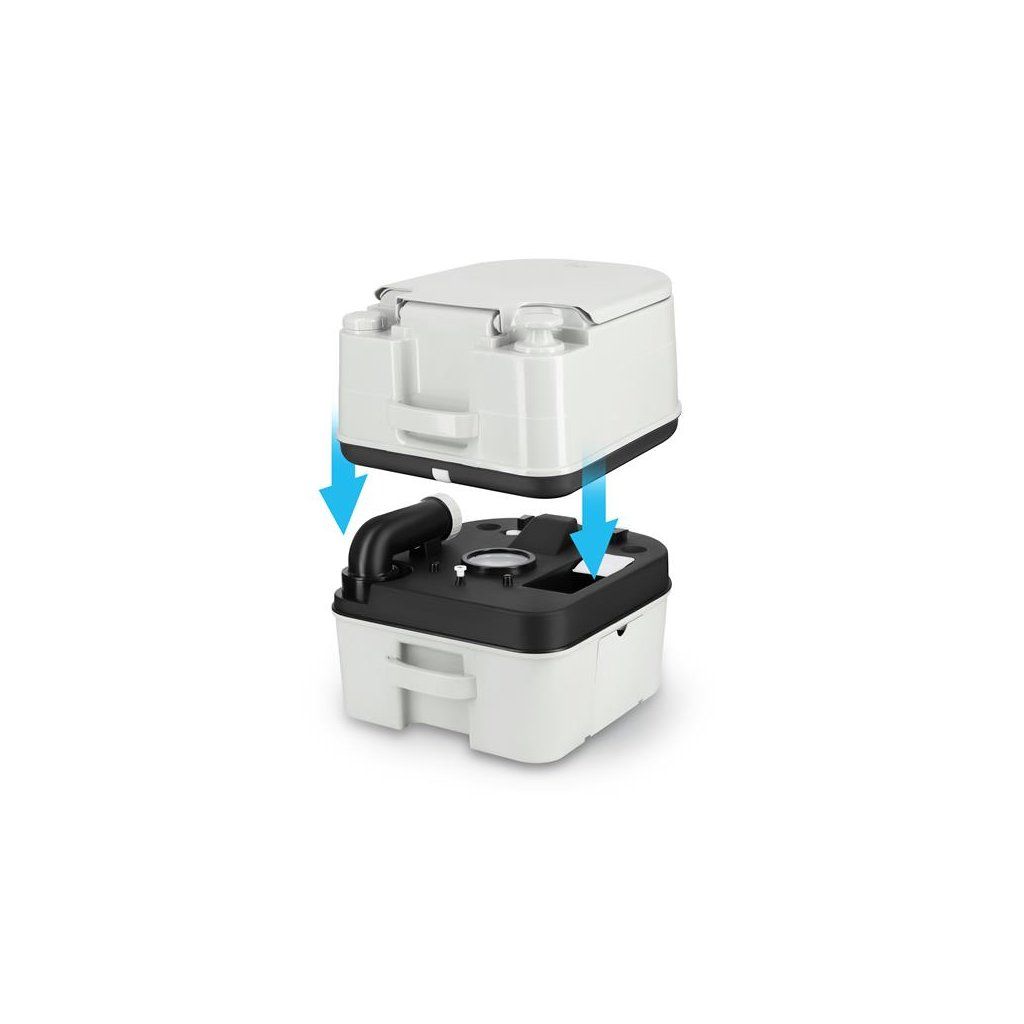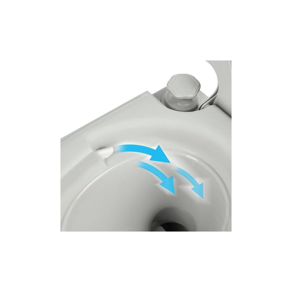 Toaleta je vyrobena z odolného a vlhkuvzdorného PP (polypropylenu). Použití těsného šoupátkového ventilu účinně izoluje nečistoty a zabraňuje úniku pachů. Splachovací systém je založen na jednoduchém a spolehlivém ručně poháněném mechanismu, který umožňuje používat toaletu bez přístupu k elektřině nebo vodovodním instalacím. Široké prkýnko a ergonomická výška zajišťují pohodlí pro všechny uživatele – bez ohledu na věk.