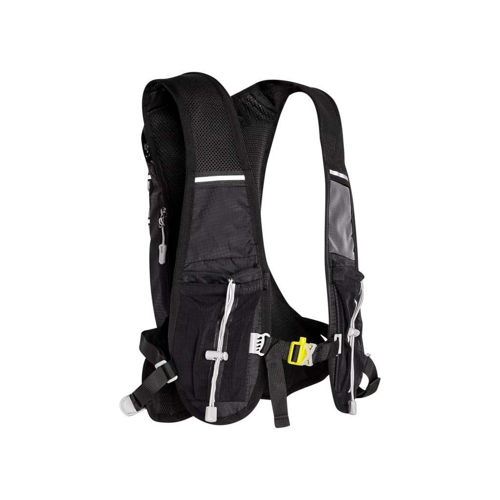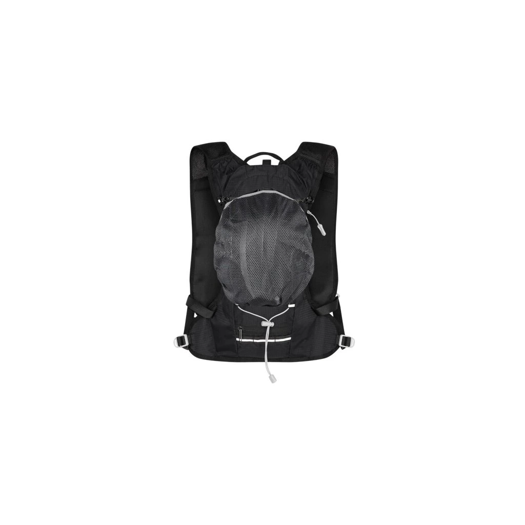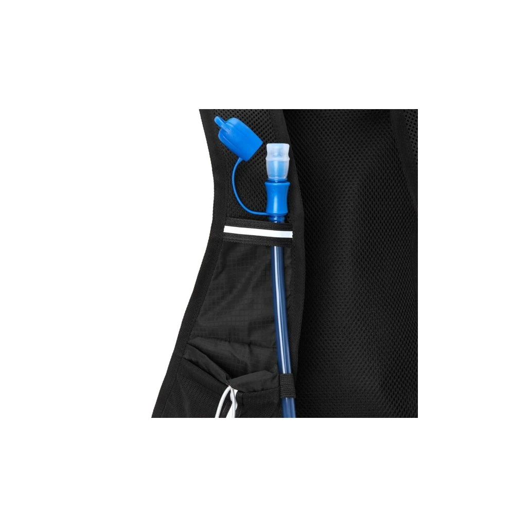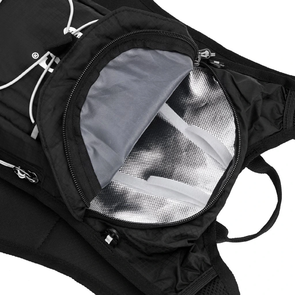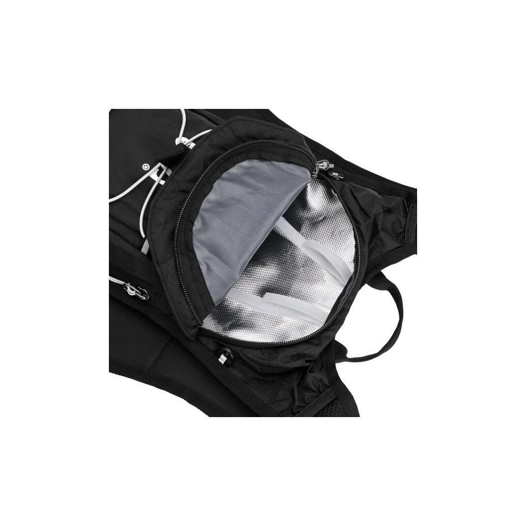Hlavní komora batohu je opatřena přepážkou, v horní části se nachází 2 suché zipy pro zavěšení hydrovaku (není součástí dodávky). Zadní strana hlavní komory je opatřena hliníkovou fólií, která slouží jako izolace mezi hydrovakem a zády, takže nápoj se nebude ohřívat teplem od zad. Hadičku hydrovaku lze vyvést průvlaky na pravé i na levé straně pod ramenními panely. Přední strana batohu je opatřena gumovým lankem s brzdičkou, pod které lze uložit například karimatku. Níže nalezneme kapsu, ve které se skrývá síťka, kterou lze vytáhnout a pomocí karabinek připnout ke stranám batohu, síťka následně vytvoří kapsu, co které můžeme uložit například cyklistickou helmu, ešus apod.. Pod kapsou je reflexní panel, ke kterému si můžeme připnout další vybavení. Na pravé straně se skrývá další kapsa na zip, která je ideální pro telefon, peněženku, nebo například klíče. Na horní straně batohu je poutko pro snadné přenášení batohu v ruce. Záda a ramenní popruhy jsou vyrobeny ze síťoviny doplněné o prodyšnou pěnu, která zvyšuje prodyšnost panelu a záda se budou méně potit. Ramenní popruhy jsou opatřeny reflexními řemínky pro protažení hadičky od hydrovaku a kapsami ze síťoviny. Na levém popruhu se navíc nachází kapsička s průhlednou čelní stranou, do které lze uložit například kartičku pro případ ztráty, startovní číslo a podobně. Ramenní popruhy jsou spojeny hrudním pásem, který lze výškově nastavit. Popruh je spojen plastovou přezkou s píšťalkou.