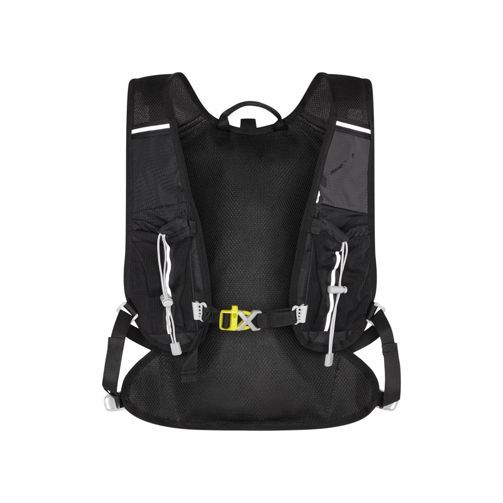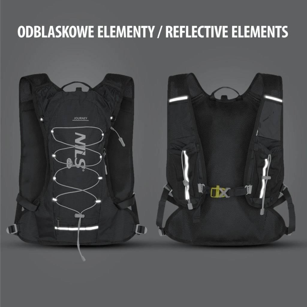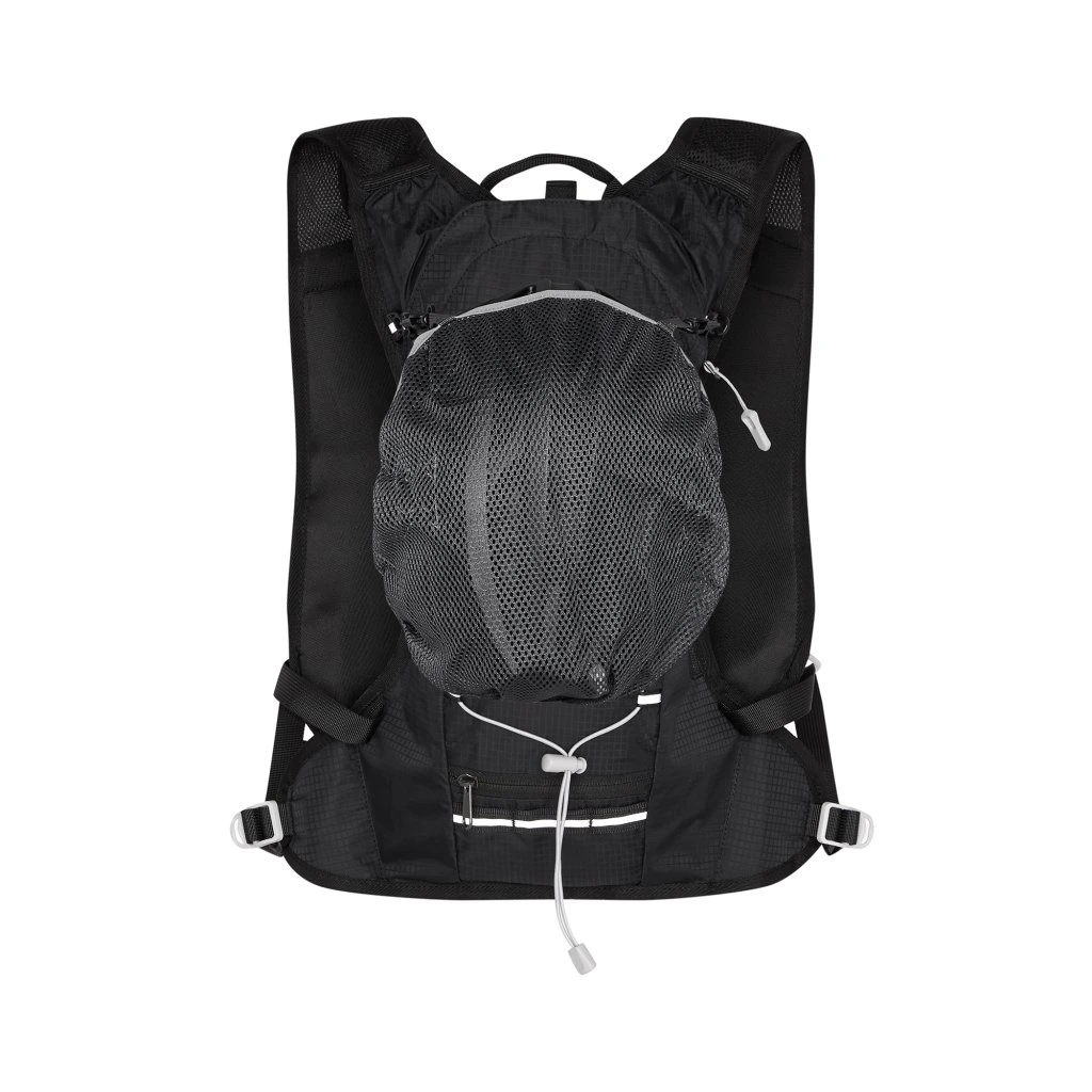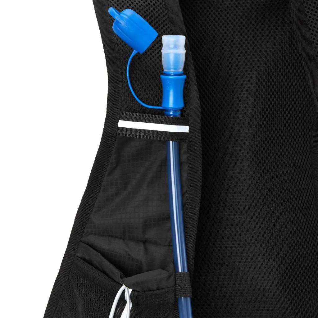 Hlavní komora batohu je opatřena přepážkou, v horní části se nachází 2 suché zipy pro zavěšení hydrovaku (není součástí dodávky). Zadní strana hlavní komory je opatřena hliníkovou fólií, která slouží jako izolace mezi hydrovakem a zády, takže nápoj se nebude ohřívat teplem od zad. Hadičku hydrovaku lze vyvést průvlaky na pravé i na levé straně pod ramenními panely. Přední strana batohu je opatřena gumovým lankem s brzdičkou, pod které lze uložit například karimatku. Níže nalezneme kapsu, ve které se skrývá síťka, kterou lze vytáhnout a pomocí karabinek připnout ke stranám batohu, síťka následně vytvoří kapsu, co které můžeme uložit například cyklistickou helmu, ešus apod.. Pod kapsou je reflexní panel, ke kterému si můžeme připnout další vybavení. Na pravé straně se skrývá další kapsa na zip, která je ideální pro telefon, peněženku, nebo například klíče. Na horní straně batohu je poutko pro snadné přenášení batohu v ruce. Záda a ramenní popruhy jsou vyrobeny ze síťoviny doplněné o prodyšnou pěnu, která zvyšuje prodyšnost panelu a záda se budou méně potit. Ramenní popruhy jsou opatřeny reflexními řemínky pro protažení hadičky od hydrovaku a kapsami ze síťoviny. Na levém popruhu se navíc nachází kapsička s průhlednou čelní stranou, do které lze uložit například kartičku pro případ ztráty, startovní číslo a podobně. Ramenní popruhy jsou spojeny hrudním pásem, který lze výškově nastavit. Popruh je spojen plastovou přezkou s píšťalkou.