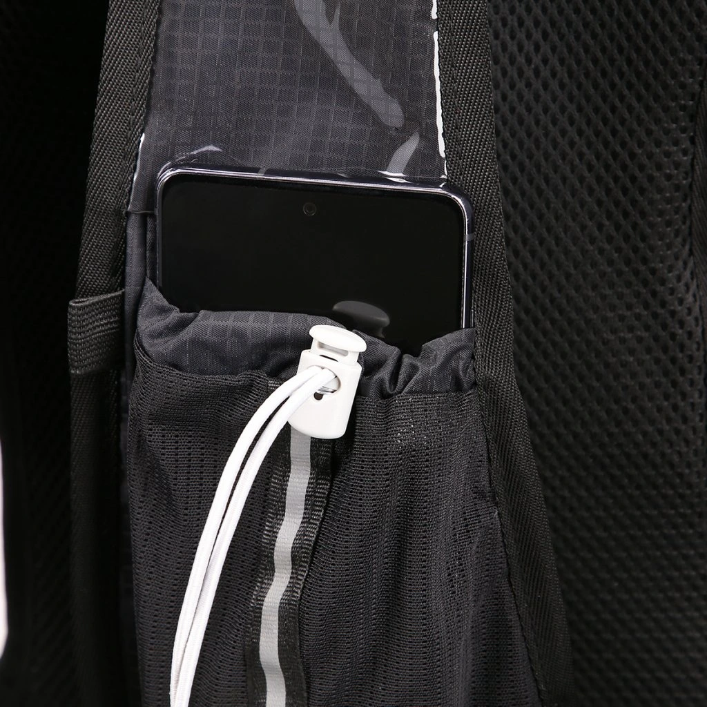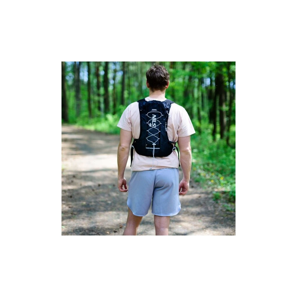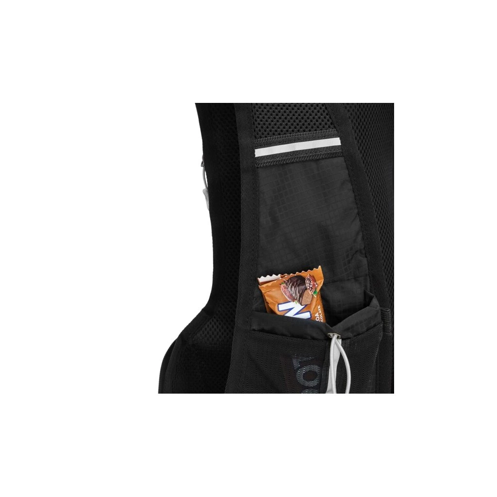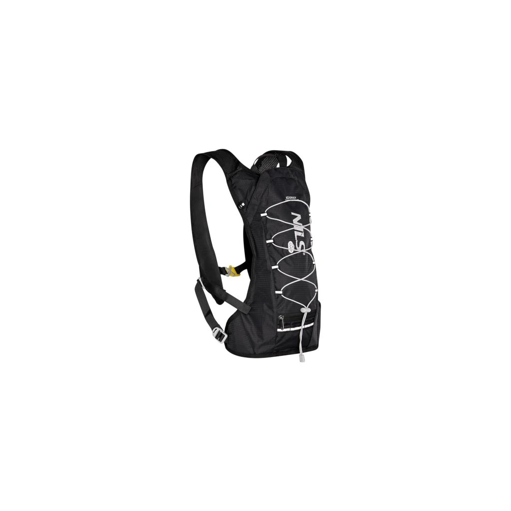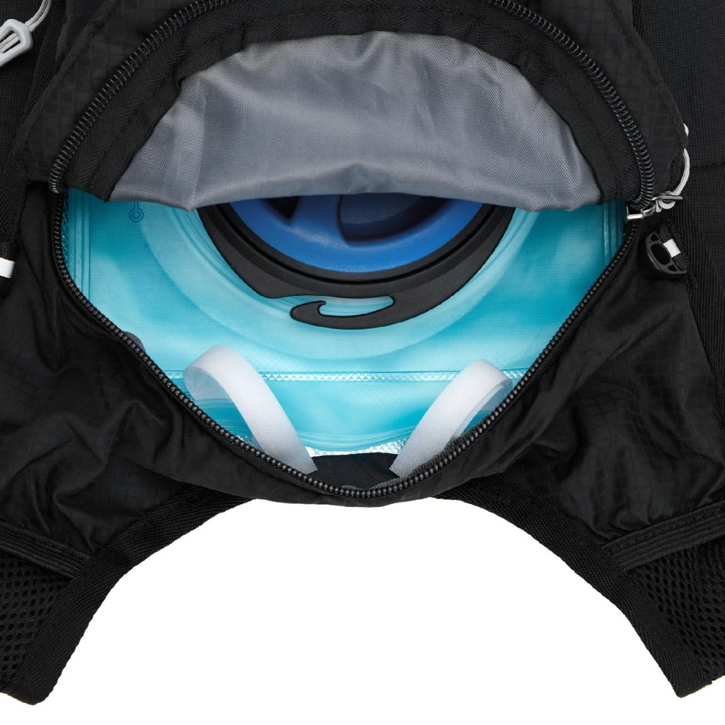 Hlavní komora batohu je opatřena přepážkou, v horní části se nachází 2 suché zipy pro zavěšení hydrovaku (není součástí dodávky). Zadní strana hlavní komory je opatřena hliníkovou fólií, která slouží jako izolace mezi hydrovakem a zády, takže nápoj se nebude ohřívat teplem od zad. Hadičku hydrovaku lze vyvést průvlaky na pravé i na levé straně pod ramenními panely. Přední strana batohu je opatřena gumovým lankem s brzdičkou, pod které lze uložit například karimatku. Níže nalezneme kapsu, ve které se skrývá síťka, kterou lze vytáhnout a pomocí karabinek připnout ke stranám batohu, síťka následně vytvoří kapsu, co které můžeme uložit například cyklistickou helmu, ešus apod.. Pod kapsou je reflexní panel, ke kterému si můžeme připnout další vybavení. Na pravé straně se skrývá další kapsa na zip, která je ideální pro telefon, peněženku, nebo například klíče. Na horní straně batohu je poutko pro snadné přenášení batohu v ruce. Záda a ramenní popruhy jsou vyrobeny ze síťoviny doplněné o prodyšnou pěnu, která zvyšuje prodyšnost panelu a záda se budou méně potit. Ramenní popruhy jsou opatřeny reflexními řemínky pro protažení hadičky od hydrovaku a kapsami ze síťoviny. Na levém popruhu se navíc nachází kapsička s průhlednou čelní stranou, do které lze uložit například kartičku pro případ ztráty, startovní číslo a podobně. Ramenní popruhy jsou spojeny hrudním pásem, který lze výškově nastavit. Popruh je spojen plastovou přezkou s píšťalkou.