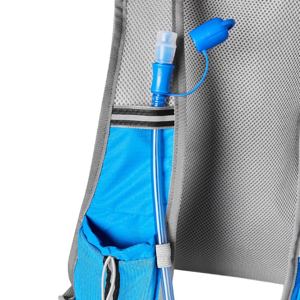 Hlavní komora batohu je opatřena přepážkou, v horní části se nachází 2 suché zipy pro zavěšení hydrovaku (není součástí dodávky). Zadní strana hlavní komory je opatřena hliníkovou fólií, která slouží jako izolace mezi hydrovakem a zády, takže nápoj se nebude ohřívat teplem od zad. Hadičku hydrovaku lze vyvést průvlaky na pravé i na levé straně pod ramenními panely. Přední strana batohu je opatřena gumovým lankem s brzdičkou, pod které lze uložit například karimatku. Níže nalezneme kapsu, ve které se skrývá síťka, kterou lze vytáhnout a pomocí karabinek připnout ke stranám batohu, síťka následně vytvoří kapsu, co které můžeme uložit například cyklistickou helmu, ešus apod.. Pod kapsou je reflexní panel, ke kterému si můžeme připnout další vybavení. Na pravé straně se skrývá další kapsa na zip, která je ideální pro telefon, peněženku, nebo například klíče. Na horní straně batohu je poutko pro snadné přenášení batohu v ruce. Záda a ramenní popruhy jsou vyrobeny ze síťoviny doplněné o prodyšnou pěnu, která zvyšuje prodyšnost panelu a záda se budou méně potit. Ramenní popruhy jsou opatřeny reflexními řemínky pro protažení hadičky od hydrovaku a kapsami ze síťoviny. Na levém popruhu se navíc nachází kapsička s průhlednou čelní stranou, do které lze uložit například kartičku pro případ ztráty, startovní číslo a podobně. Ramenní popruhy jsou spojeny hrudním pásem, který lze výškově nastavit. Popruh je spojen plastovou přezkou s píšťalkou.