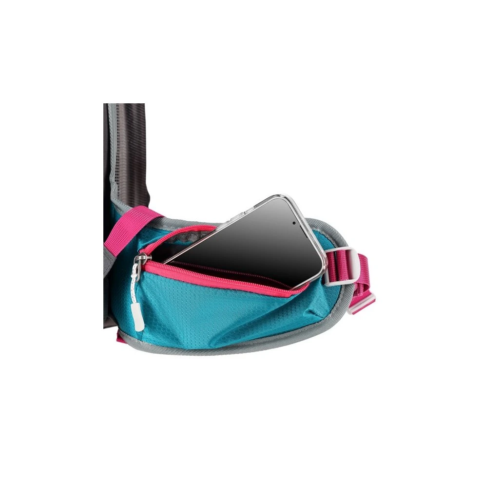 Na přezce hrudního popruhu je umístěna integrovaná záchranná píšťalka pro větší bezpečnost v nouzových situacích. Batoh dále nabízí další panel s úchyty na různé příslušenství, dvě boční síťované kapsy a kapsy na zip v bederním pásu, ideální pro uložení telefonu nebo jiných drobností.
