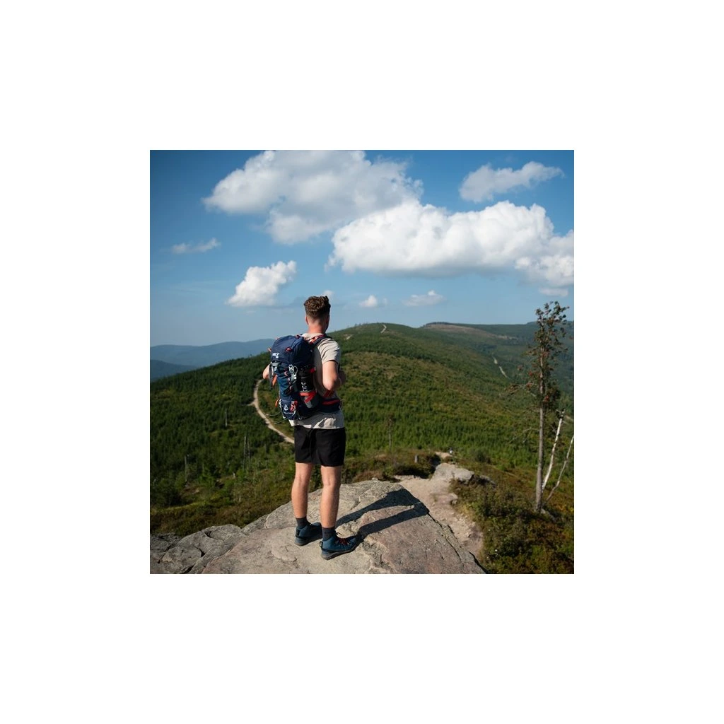 Na přezce hrudního popruhu je integrovaná záchranná píšťalka, která zvyšuje bezpečnost uživatele. Přídaná poutka umožňují připevnit například trekové hole nebo jiné příslušenství. Batoh má také dvě boční kapsy ze síťoviny a kapsy na zip na bederním pásu, ideální na telefon nebo jiné drobnosti.