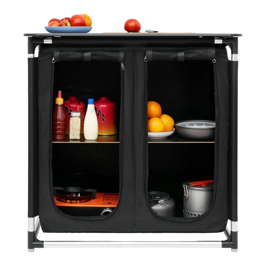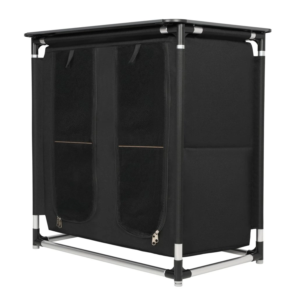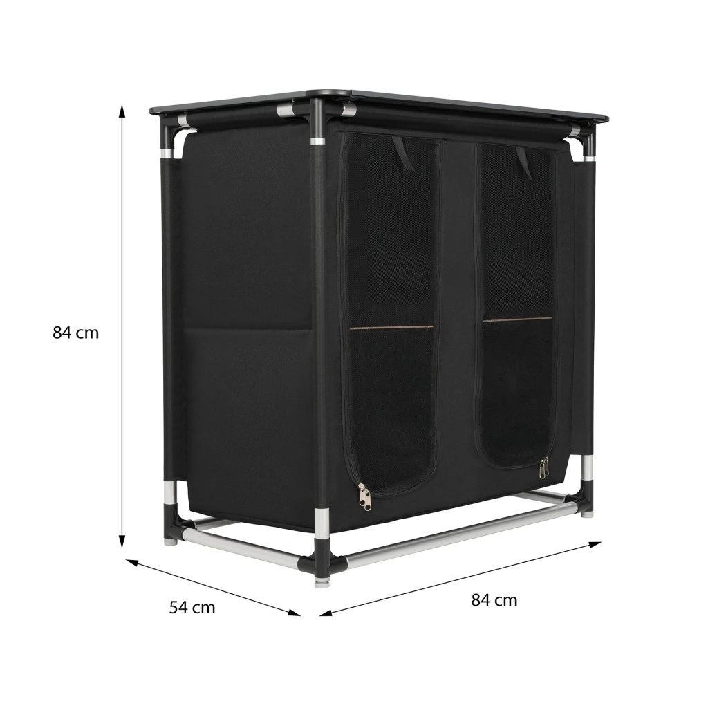 Skříň NC3032 má celkem 4 sekce, které umožňují pohodlné uložení potravin, nádobí, oblečení nebo turistického vybavení. Každá sekce je vyztužena policí z laminované překližky. Horní, pracovní desku tvoří 9 hliníkových lamel, deska má rozměr 83 x 52 cm. Přední panely na zip účinně chrání obsah před prachem, větrem a hmyzem.