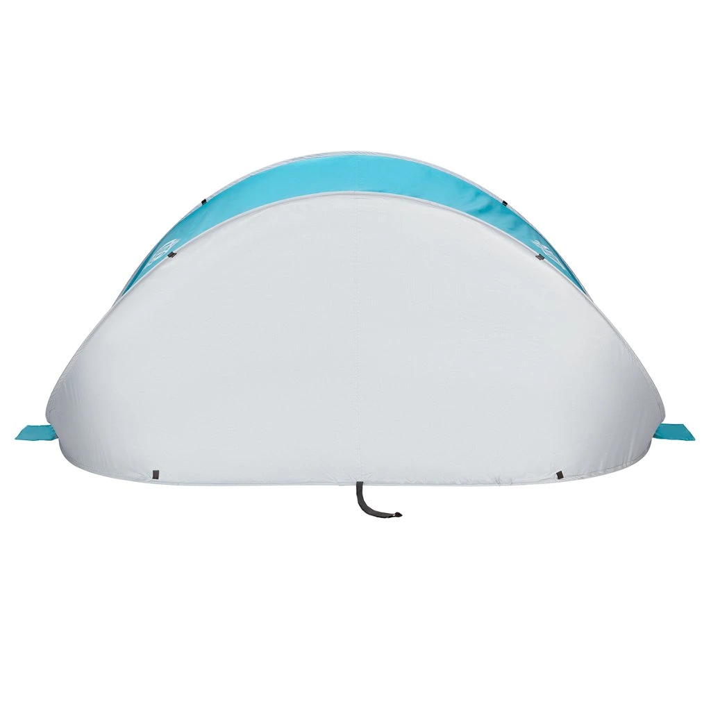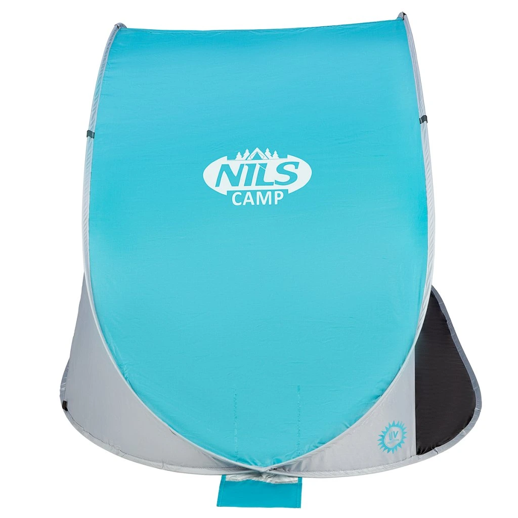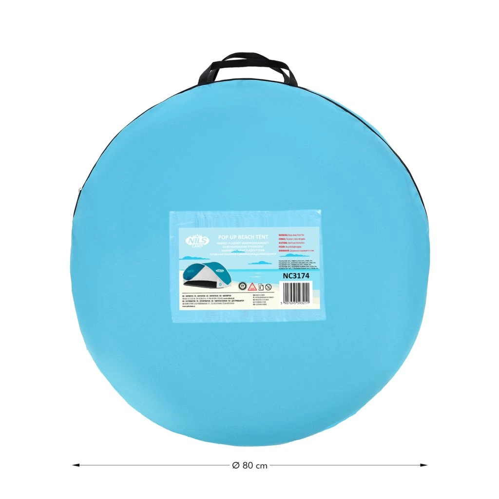 Plážový stan NILS Camp NC3174 využijete nejen během dovolené u moře, ale také na veřejném koupališti, nebo u bazénu na zahradě. Hlavní funkcí plážového stanu je ochrana před slunečními paprsky a škodlivým UV zářením. Model NC3174 odrazí až 96% UV záření. Stan je dodáván složený v kruhové tašce opatřené uchem pro snadné přenášení. Po vytažení z tašky se stan automaticky rozloží. Pro složení se použije jednoduché gesto a stan se schová opět do tašky. Podlaha o rozměrech 120 x 220 cm a výška 100 cm umožňují úkryt před sluncem jak dětem, tak rodičům. Podpůrná konstrukce přístřešku je tvořena sklo-laminátovou tyčí. Na ni je navlečena polyesterová plachta. Použitý materiál odolá i malé, dešťové přeháňce.